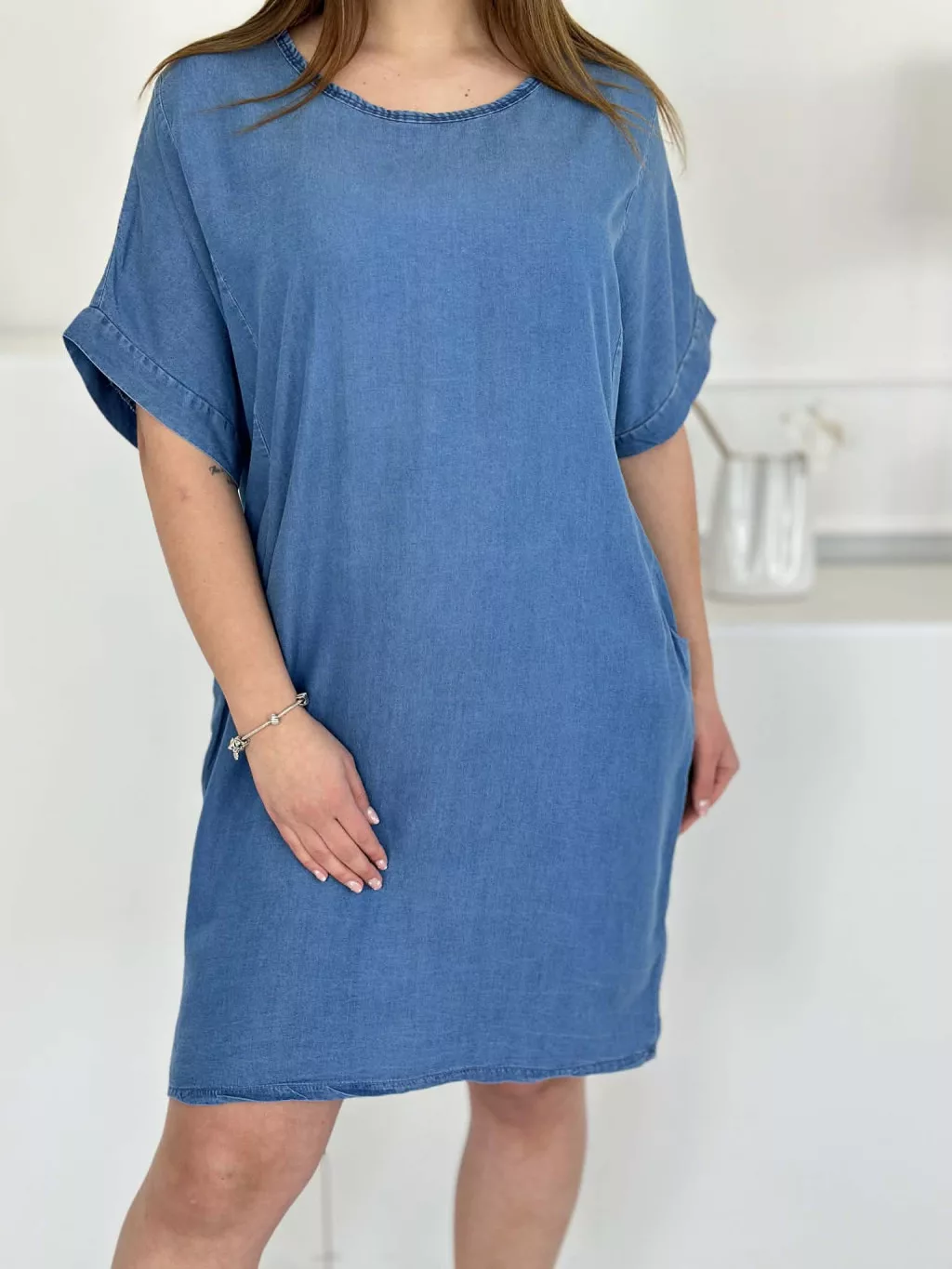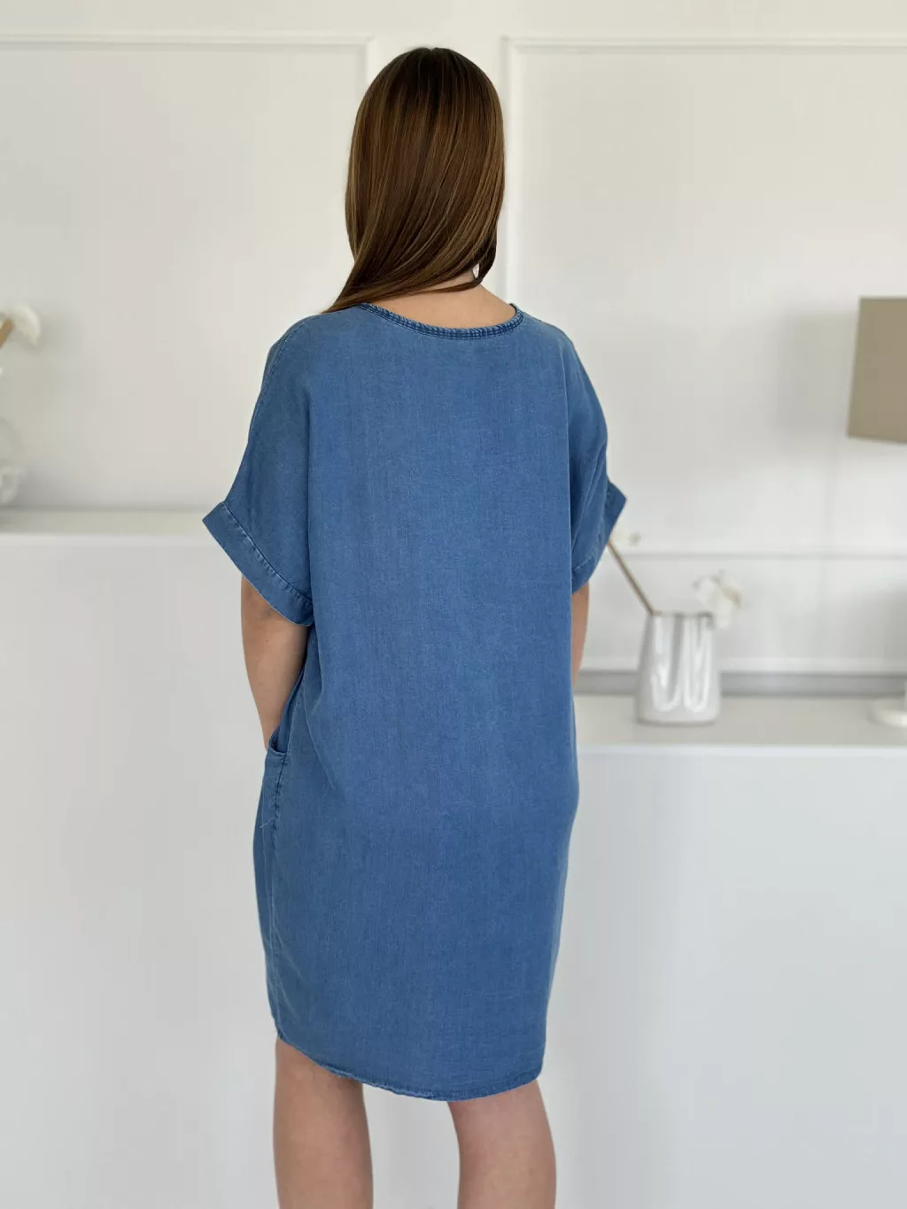 Zsebes farmerruha ,lenge fazonú, nem rugalmas anyagú. Öv nélkül! (S-XL méretre ajánljuk.)