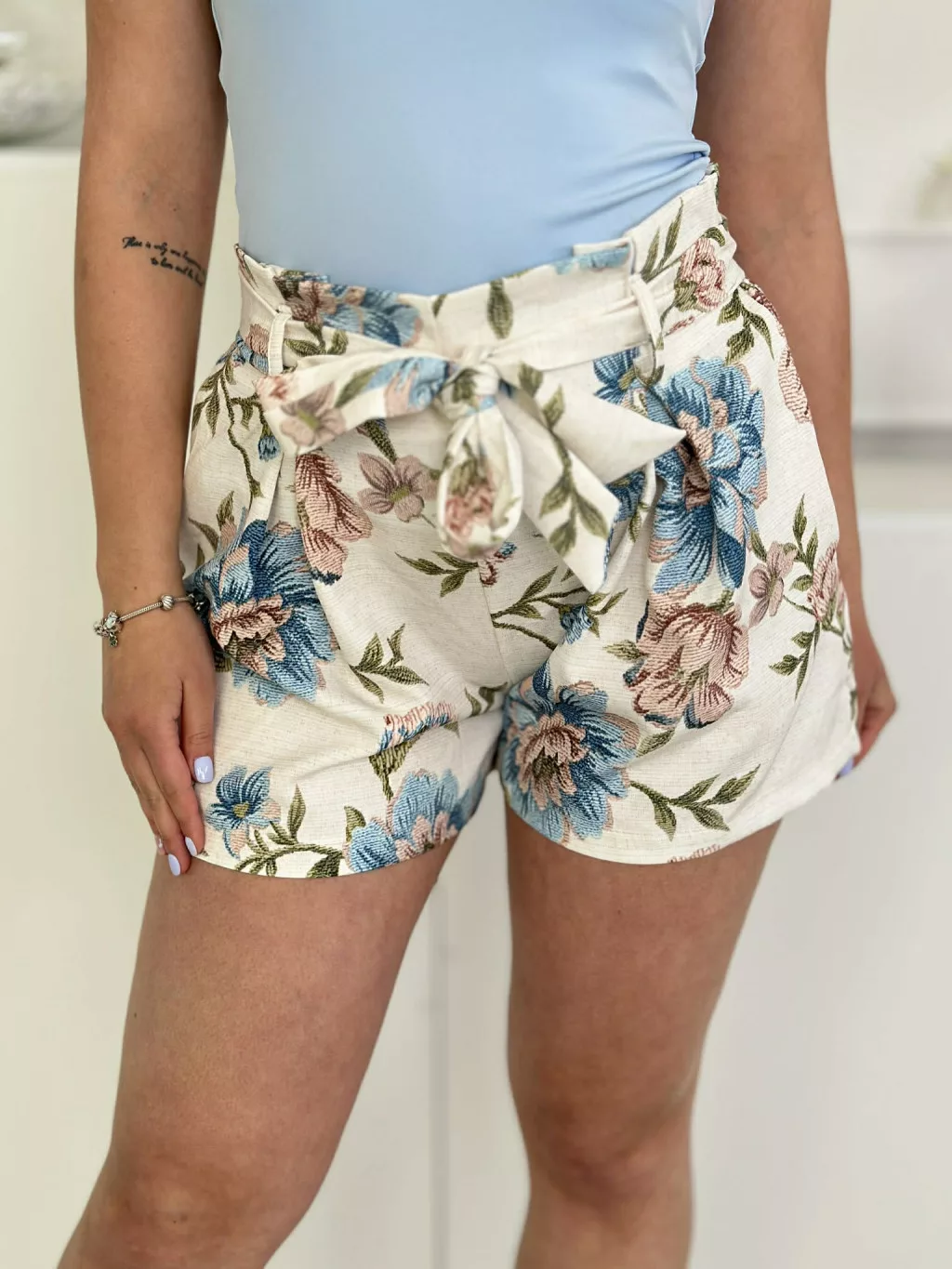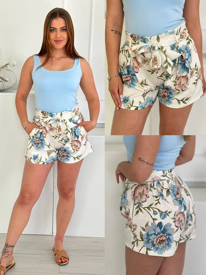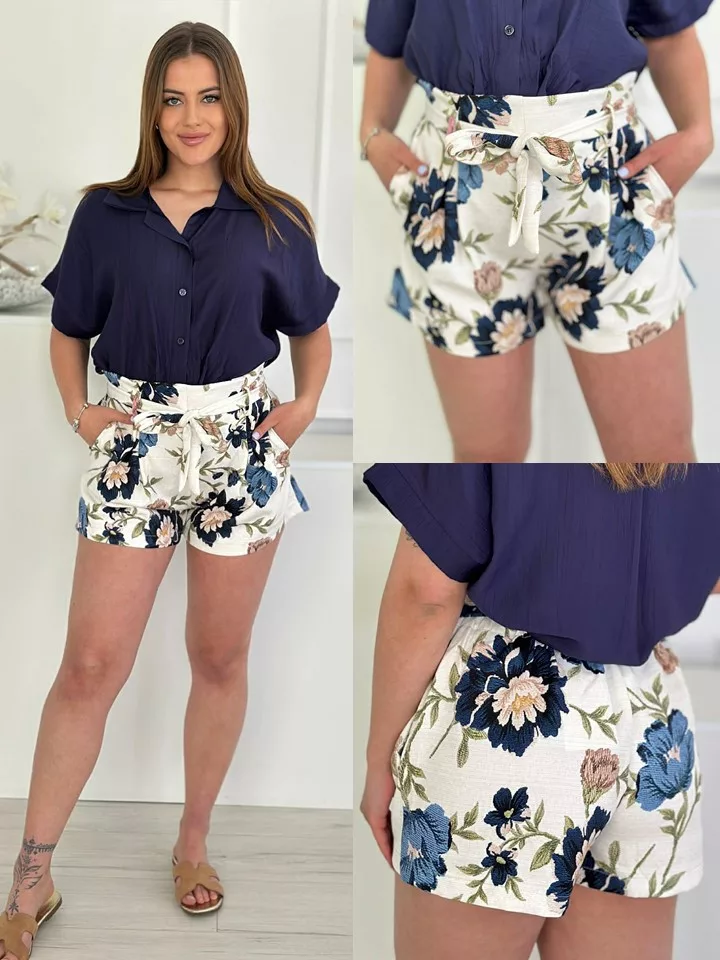 Zsebes, mintás rövidnadrág ,magas, gumis derekú, megkötős, nem rugalmas. (S-M méretre ajánljuk.)