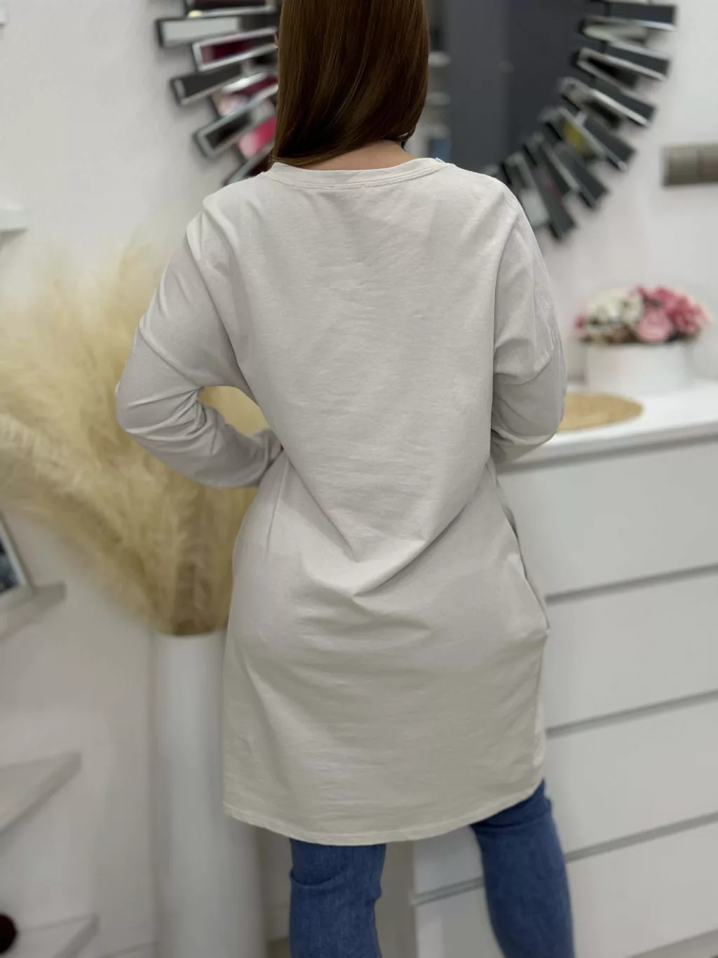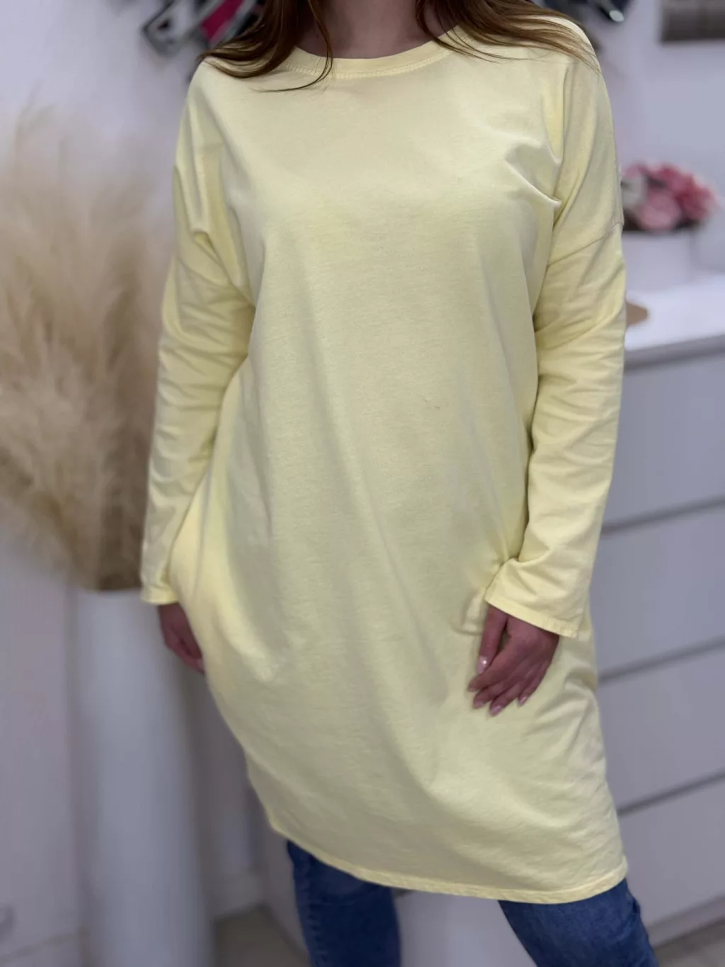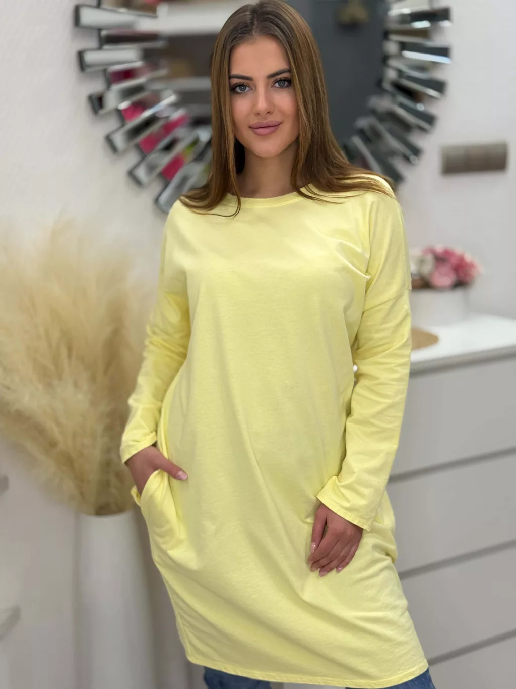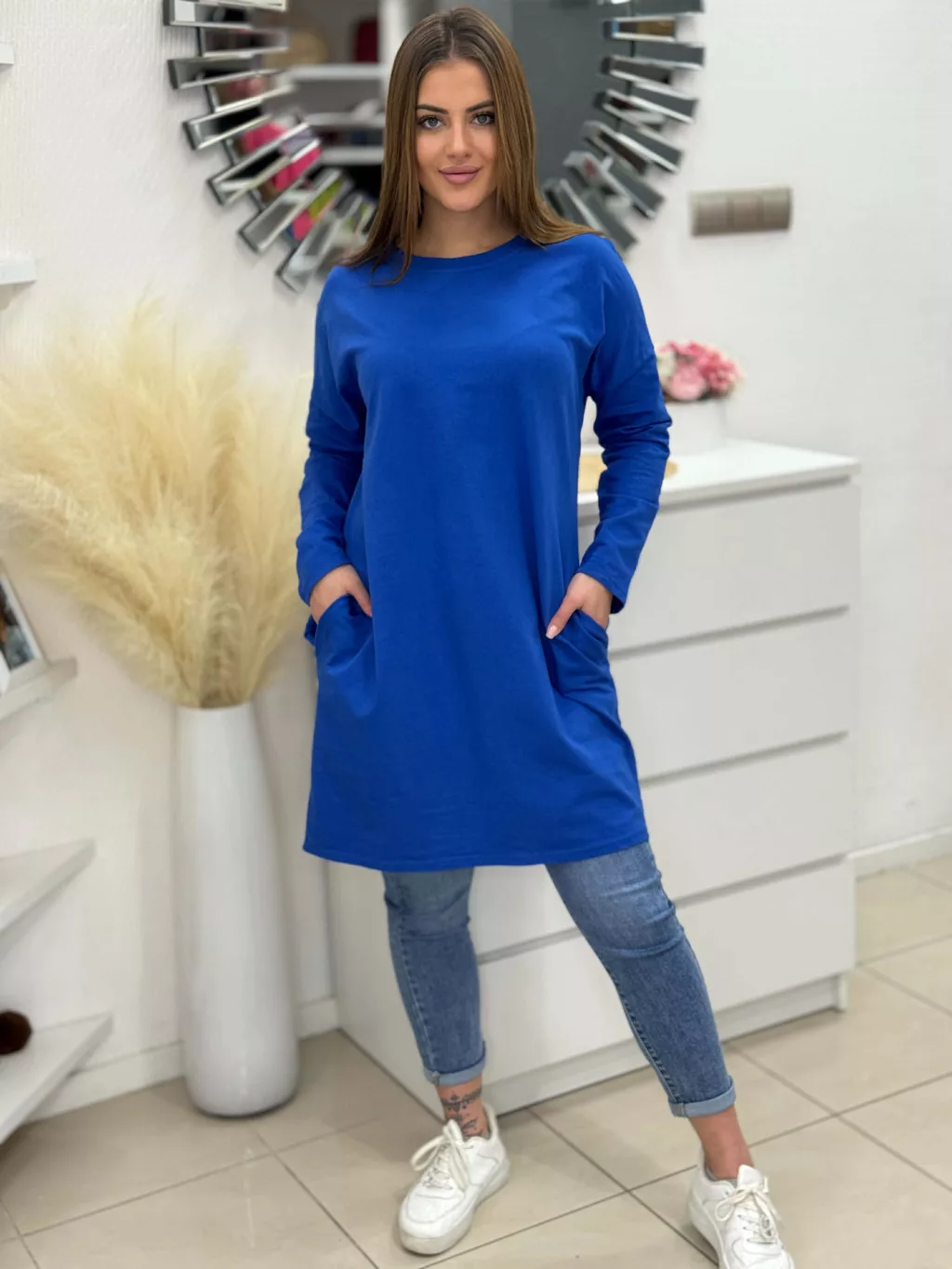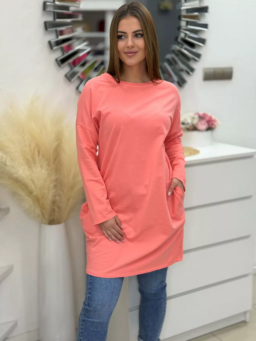 Zsebes, pamut tunika , enyhén rugalmas, lenge fazonú. (S-L méretre ajánljuk.)