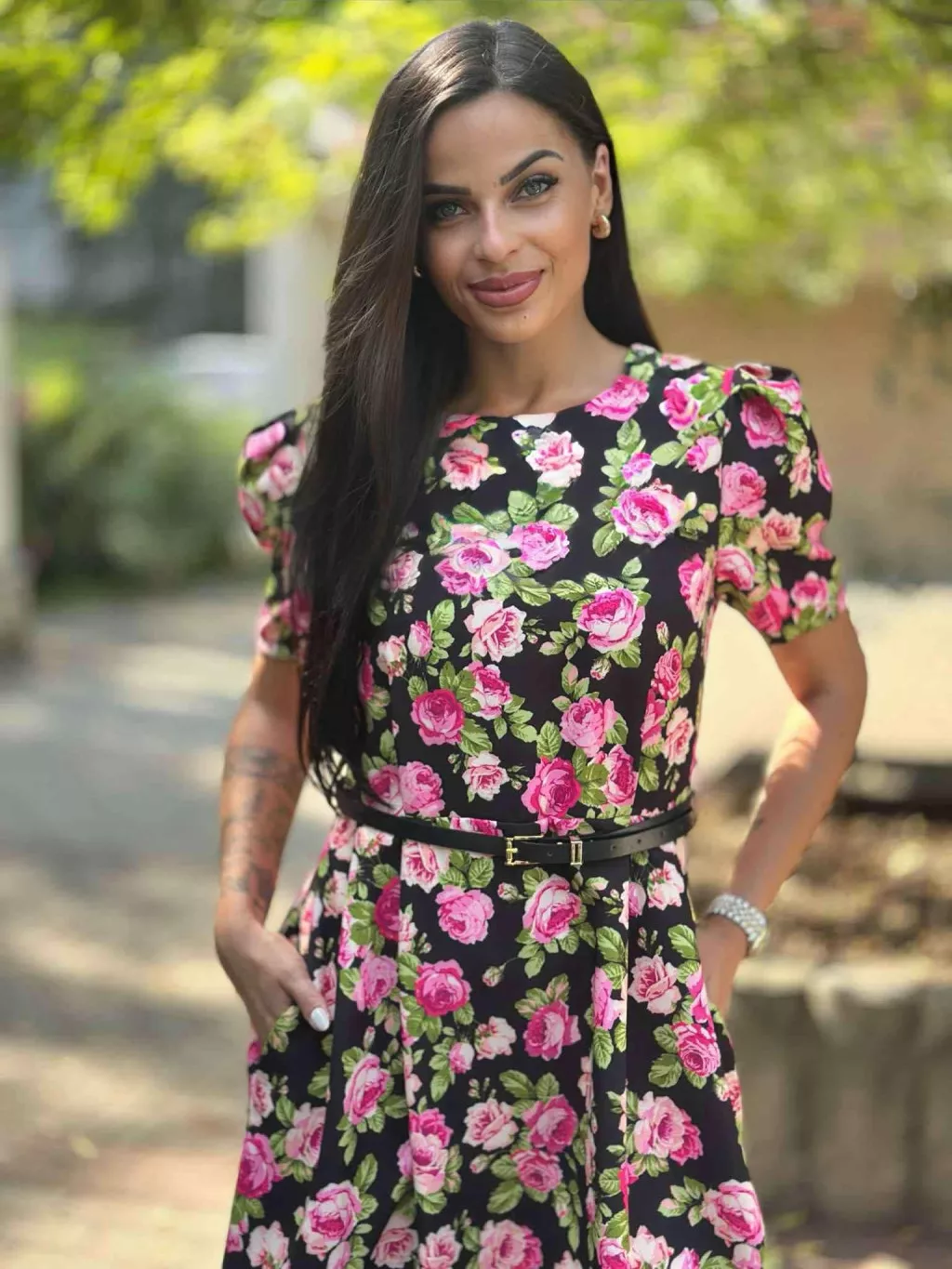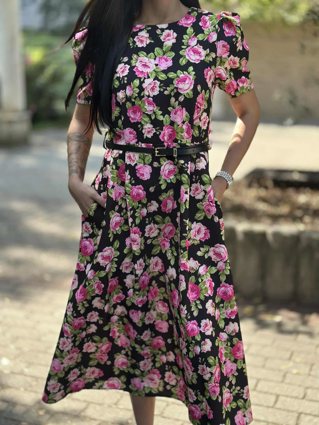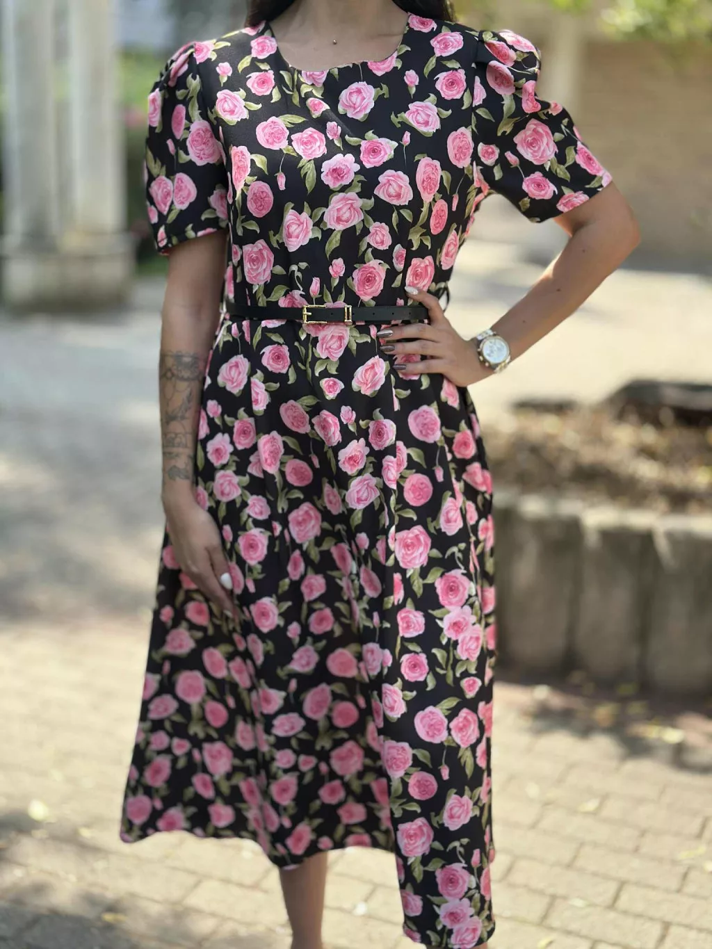 Zsebes, puffos ujjú, hátán cipzáras, nem rugalmas anyagú ruha övvel. (S-L méretre ajánljuk).