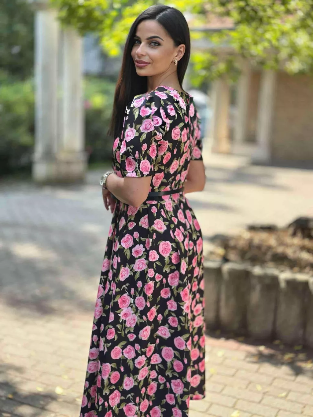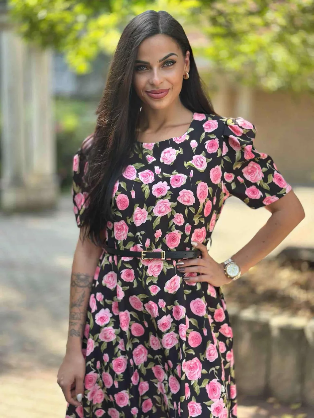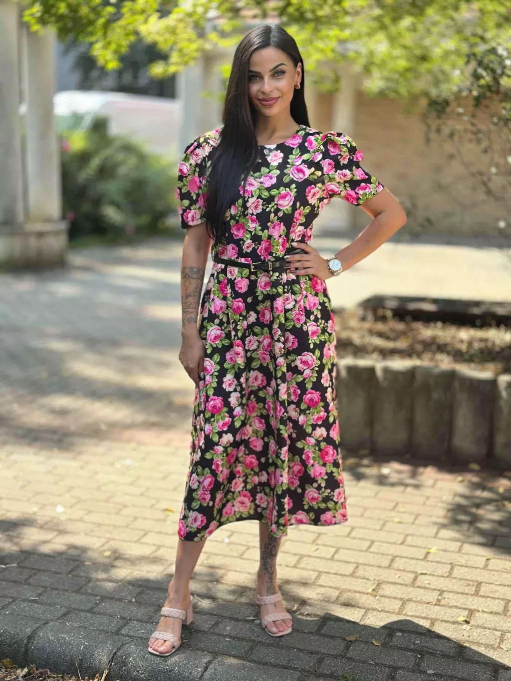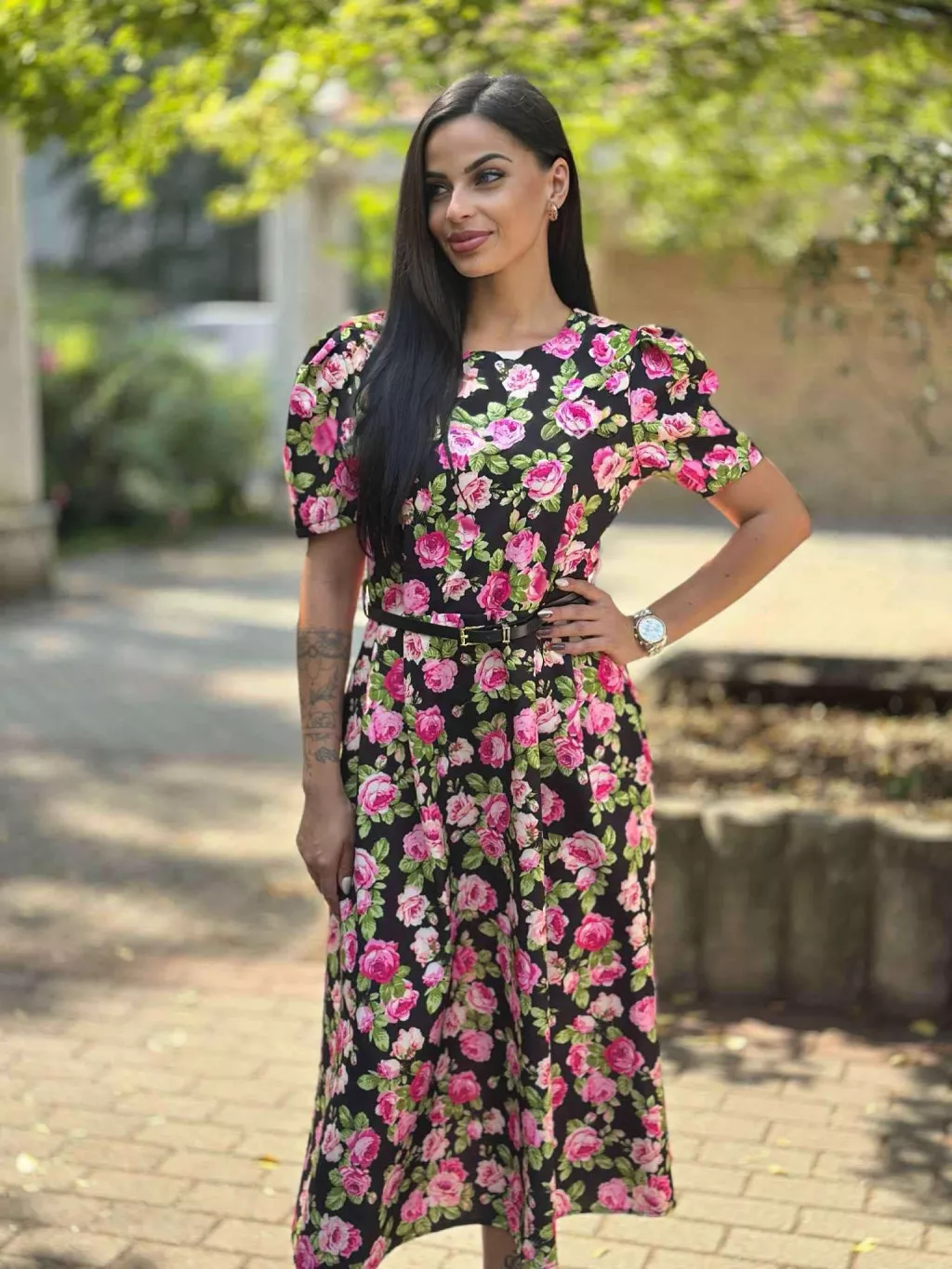 Zsebes, puffos ujjú, hátán cipzáras, nem rugalmas anyagú ruha övvel. (S-L méretre ajánljuk).