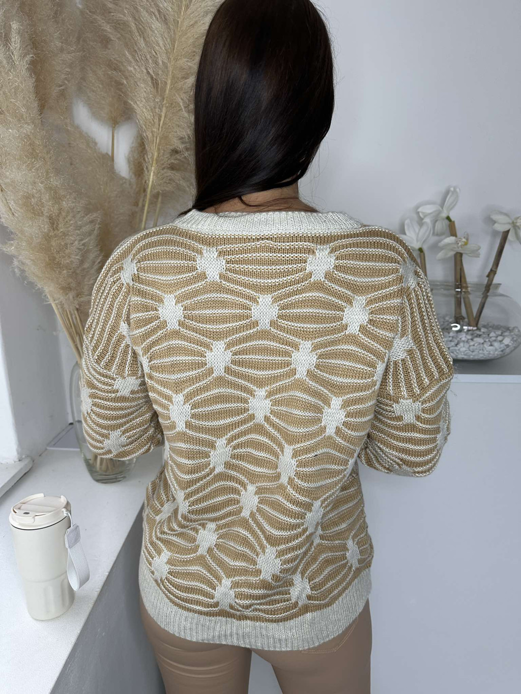 Rugalmas, vastag kötött anyagú, mintás pulóver. (S-L méretre ajánljuk.)