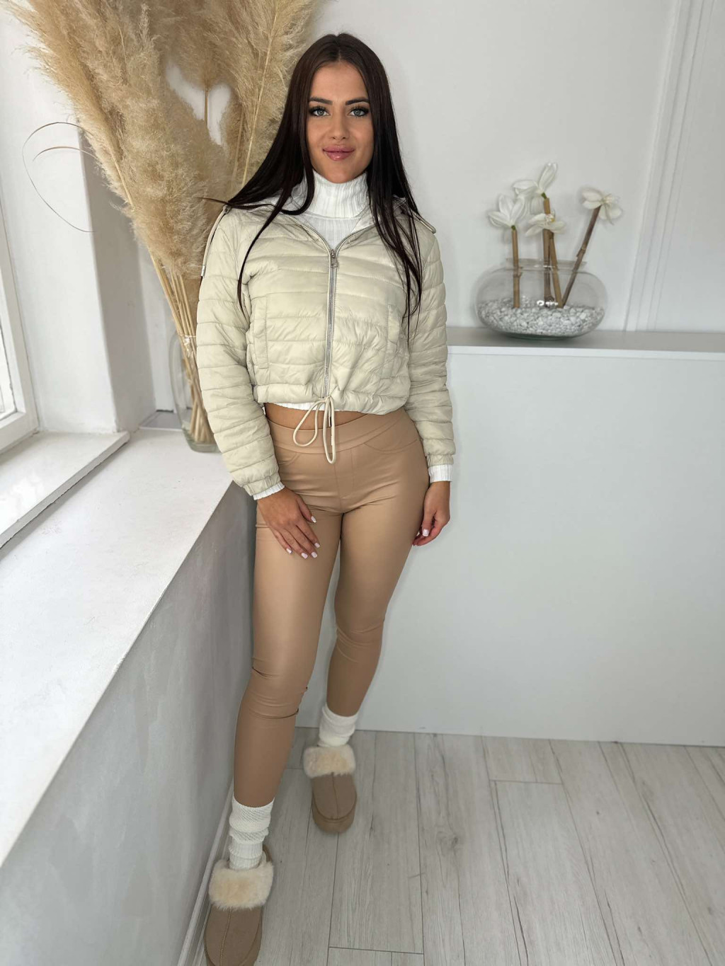 Bélelt, alul összehúzható, zsebes, kapucnis, nem rugalmas anyagú, steppelt, vékony, átmeneti kabát. A Modell S méretet visel. (S,M és L méretekben.)