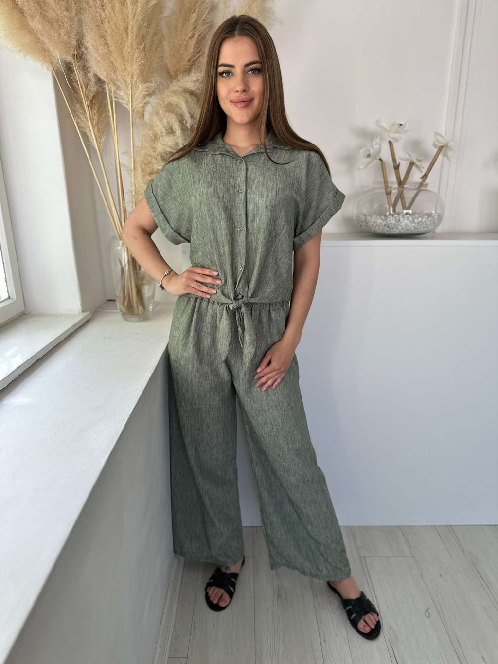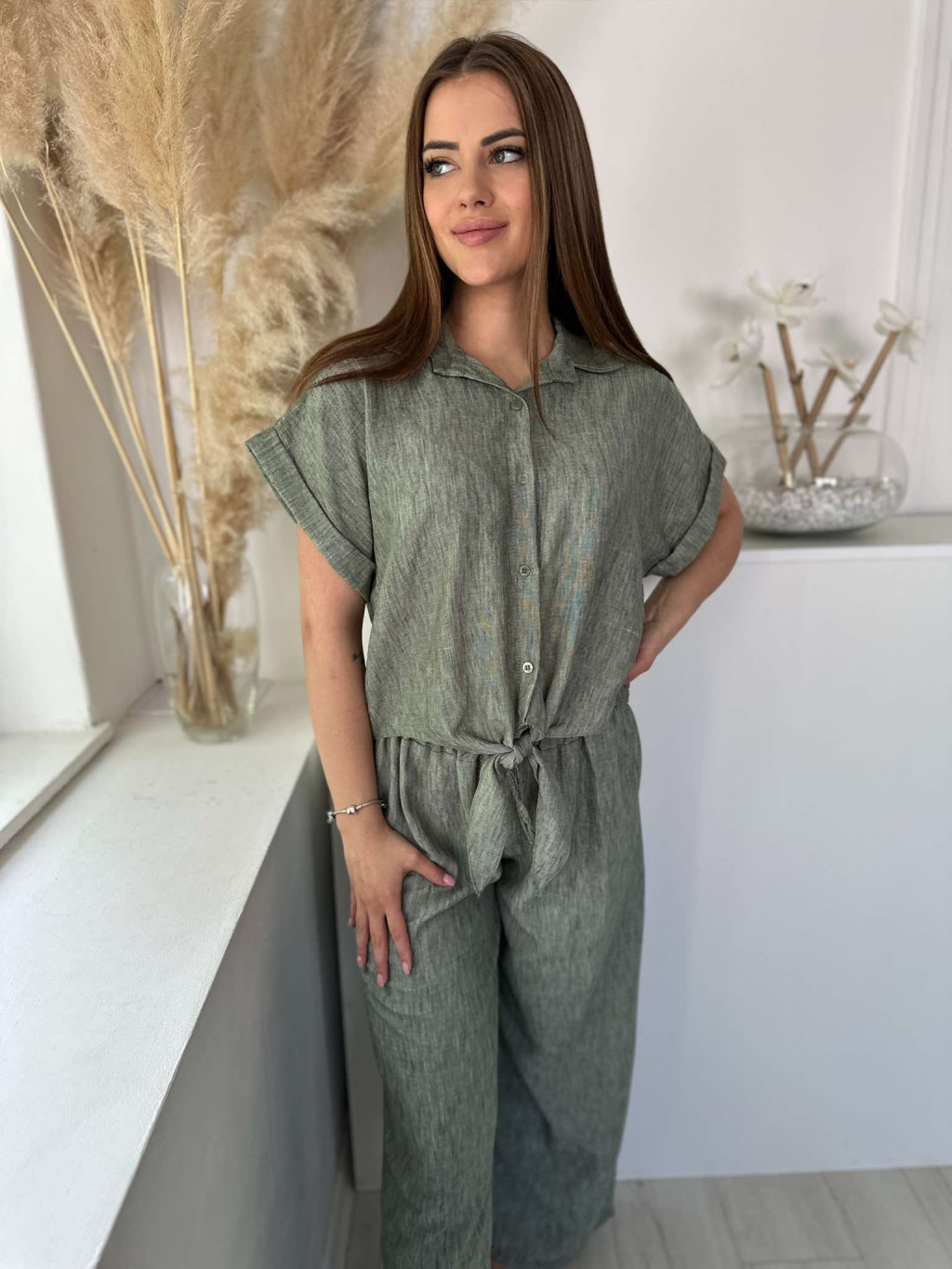 Lenge fazonú, nem rugalmas anyagú, lenvászon hatású szett. Rövid derekú, megkötős ing, magas, gumis derekú nadrág. (S-L méretre ajánljuk.)