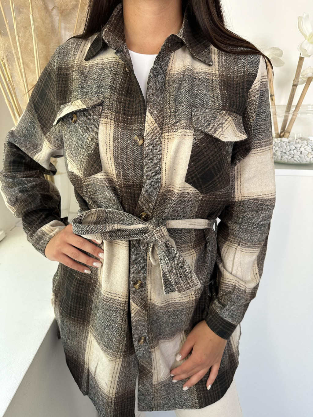 Oversize fazonú, zsebes, nem rugalmas anyagú, megktös, kockás ing. A Modell M méretet visel. (M, L és XL méretekben.)