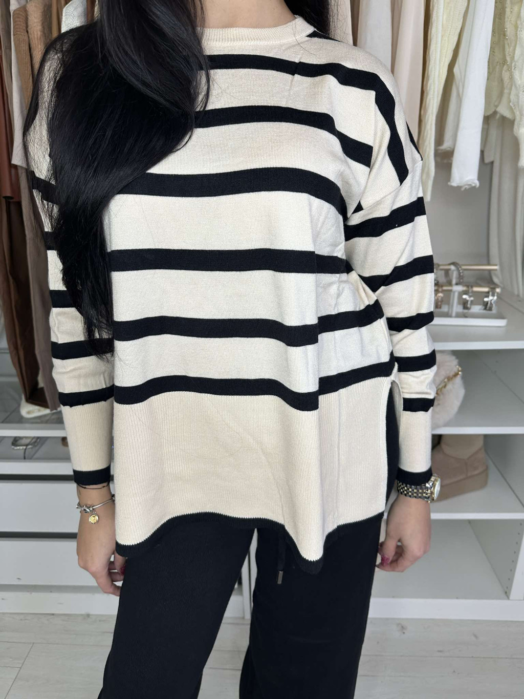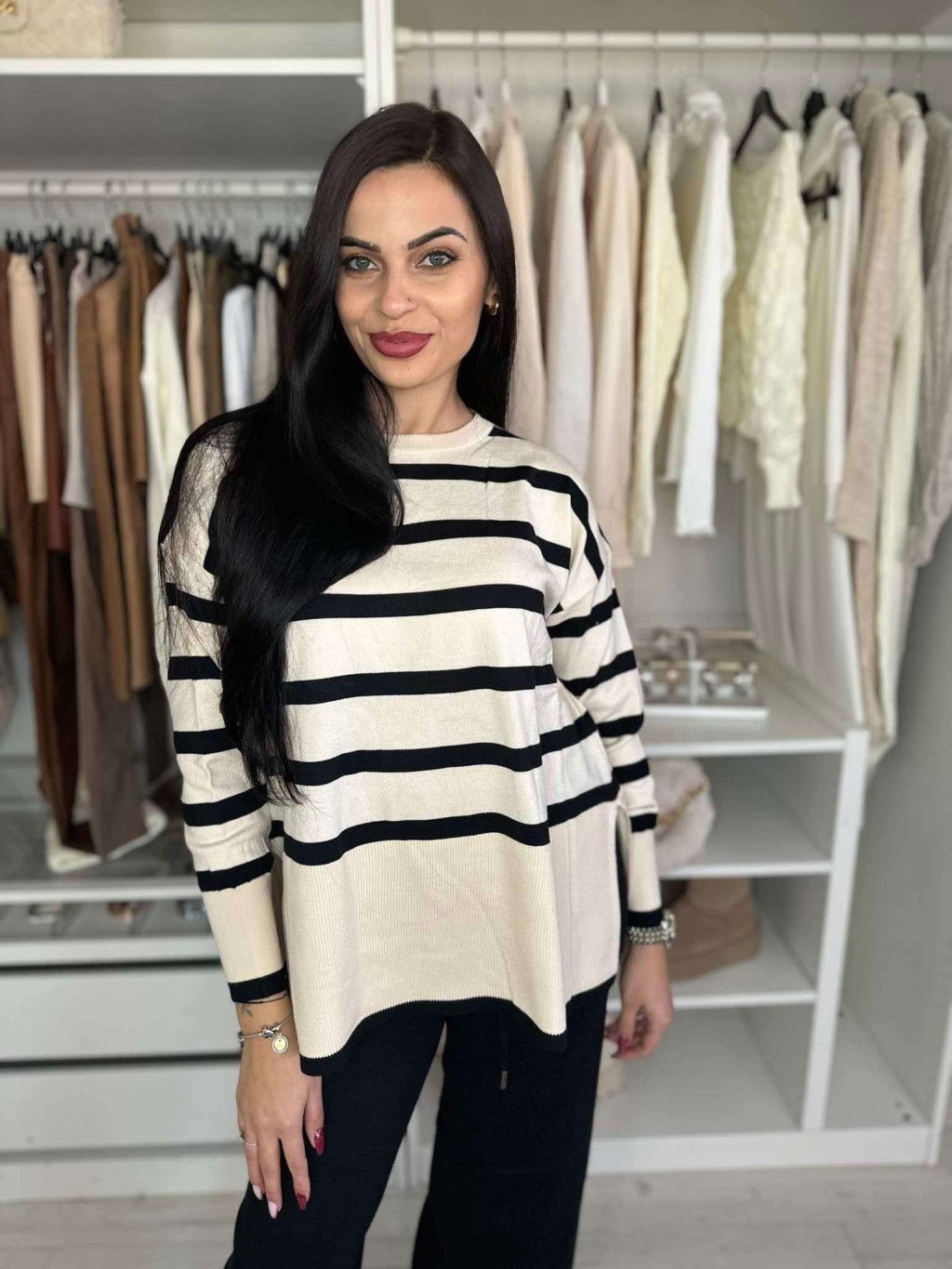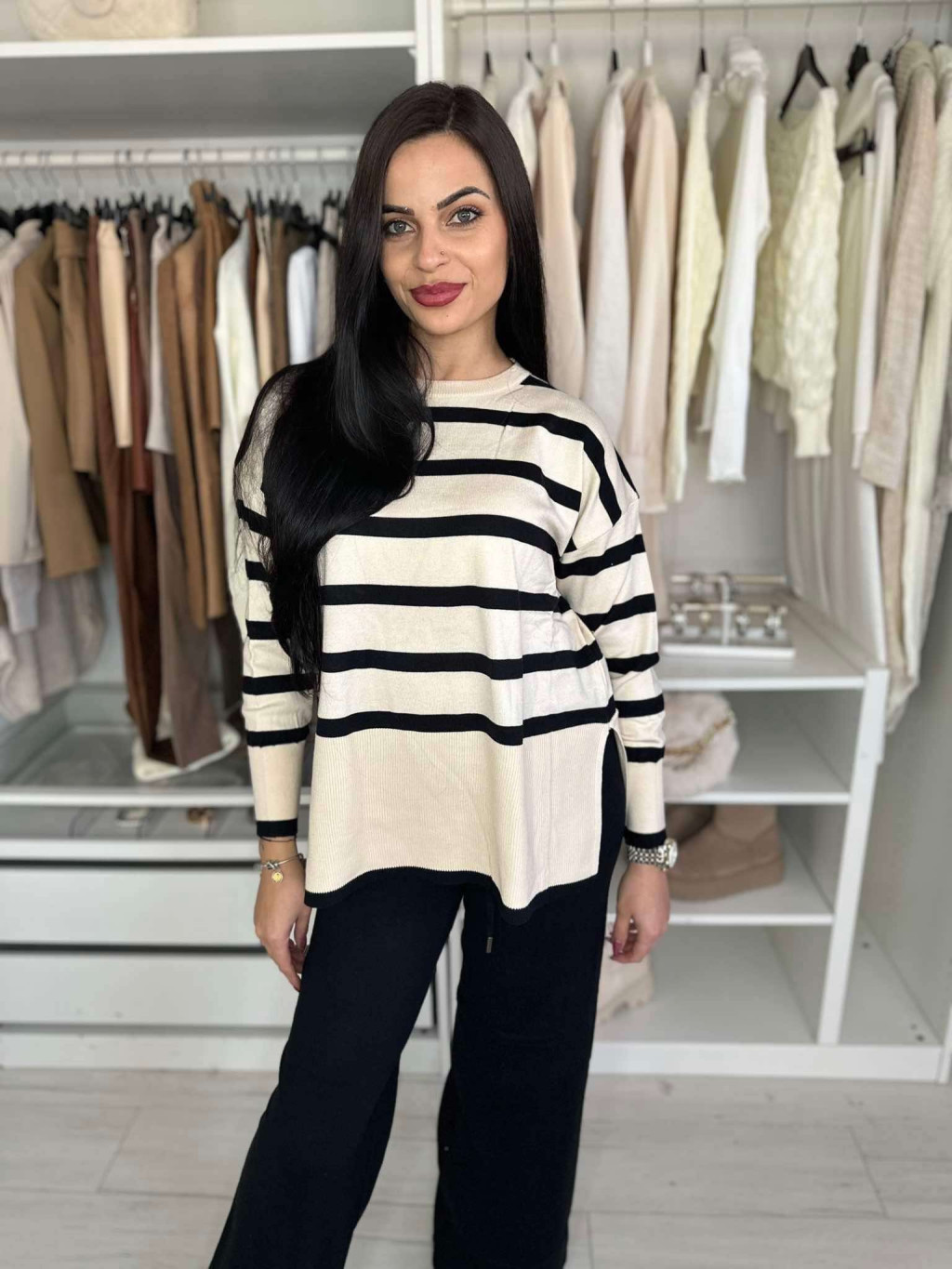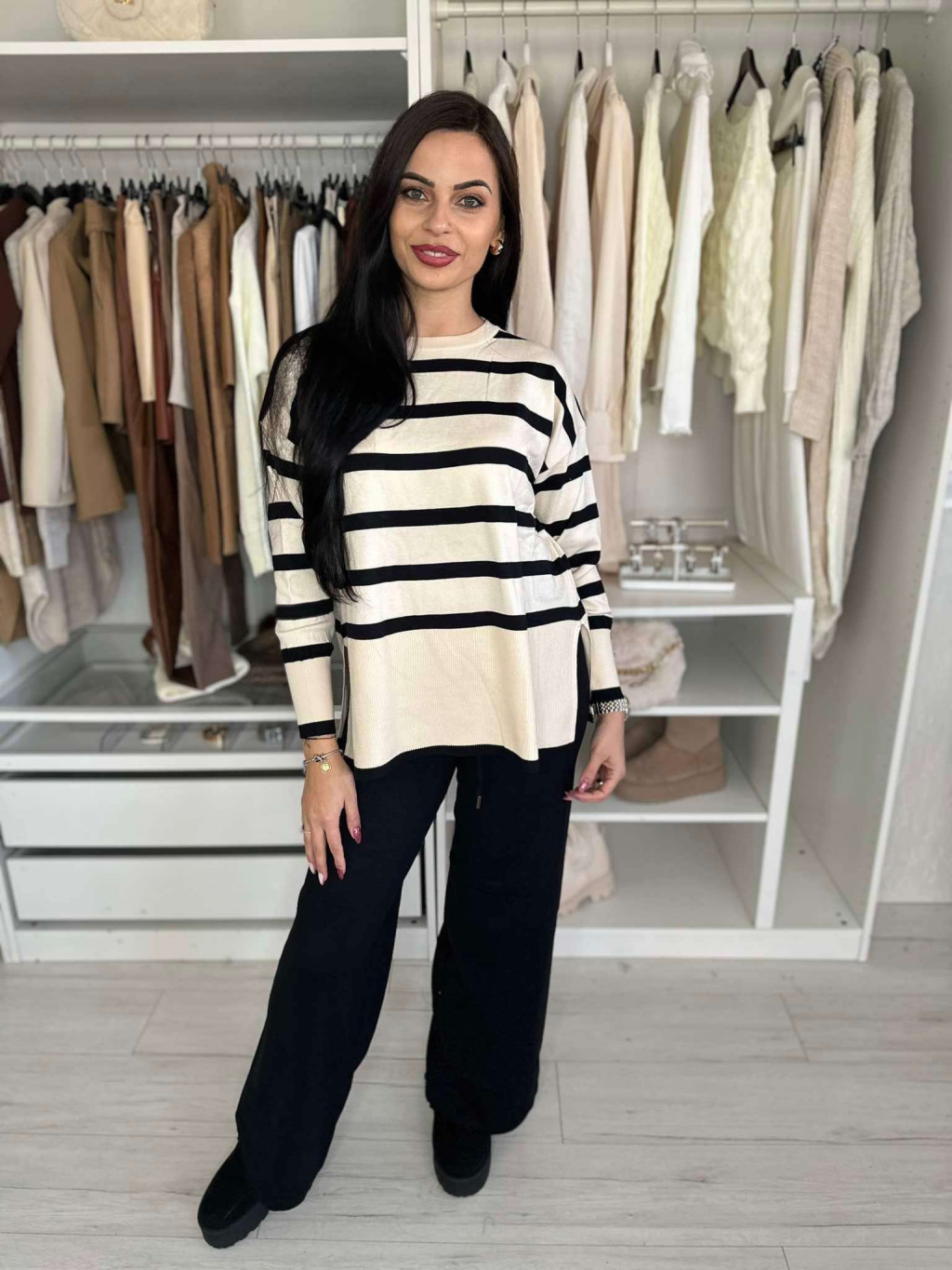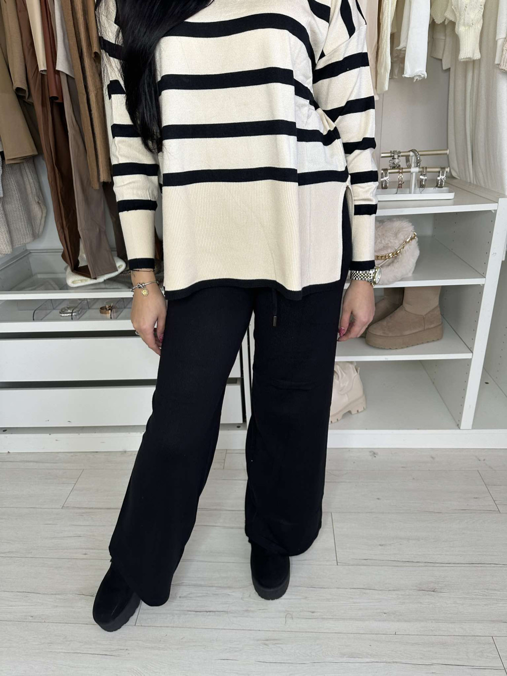Rugalmas, puha, kötött szett. Magas, gumis derekú, egyenes szárú nadrág, lenge, felsliccelt felsővel. A Modell S/M méretet visel.