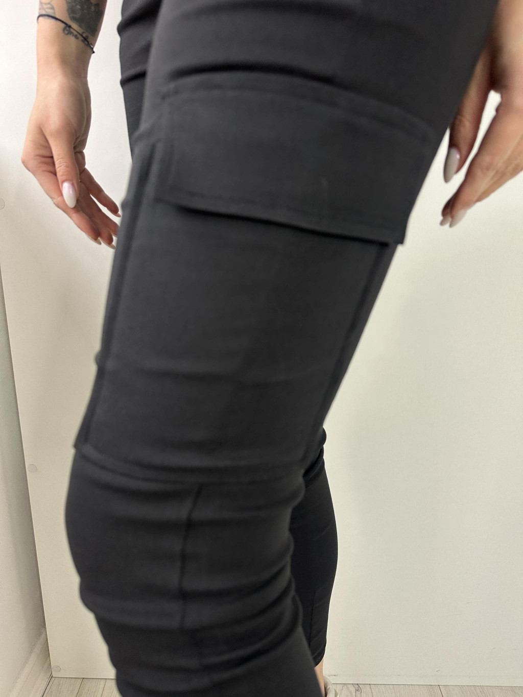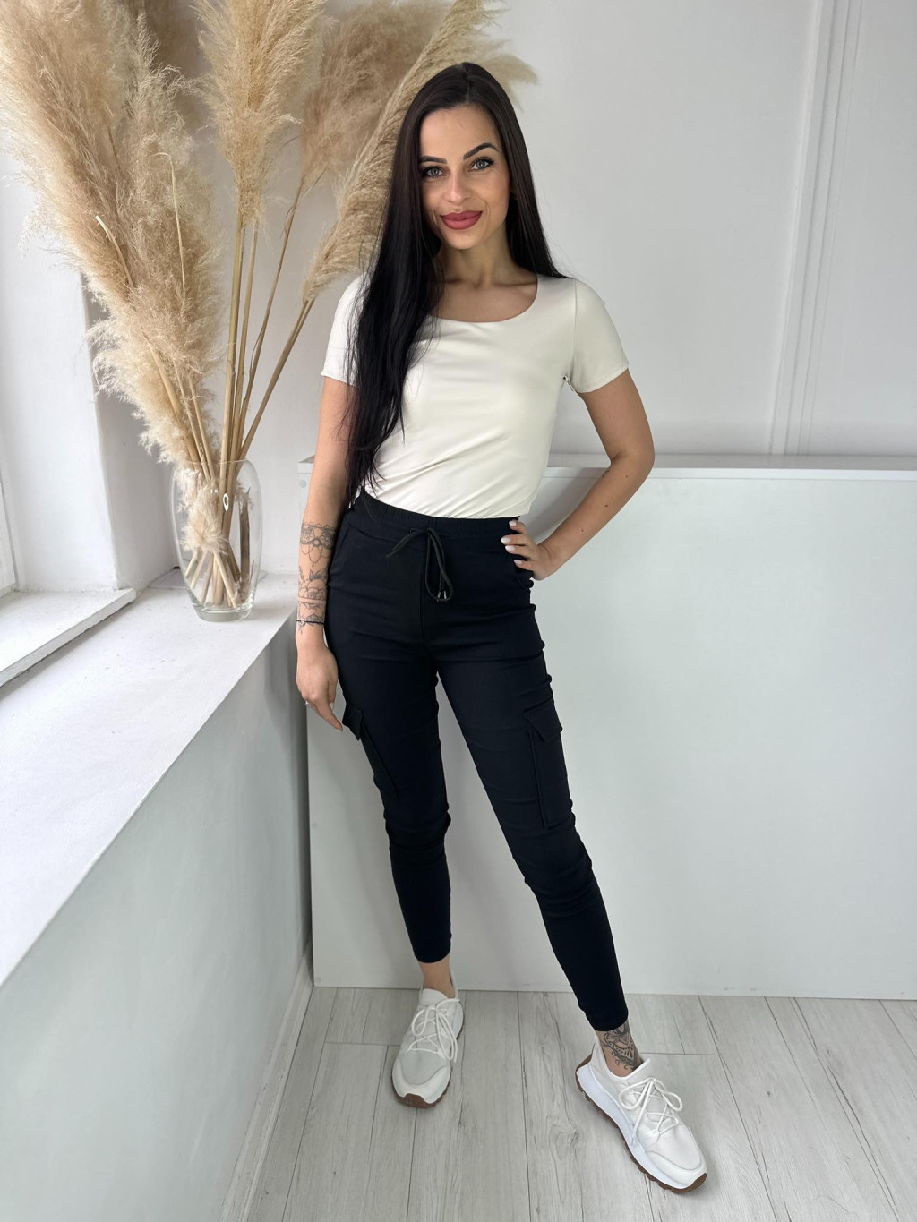Extra rugalmas anyagú, magas, gumis derekú, zsebes nadrág. A modell S/M méretet visel. (S/M, M/L és XL/XXL méretekben.)