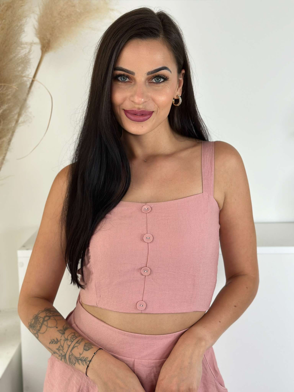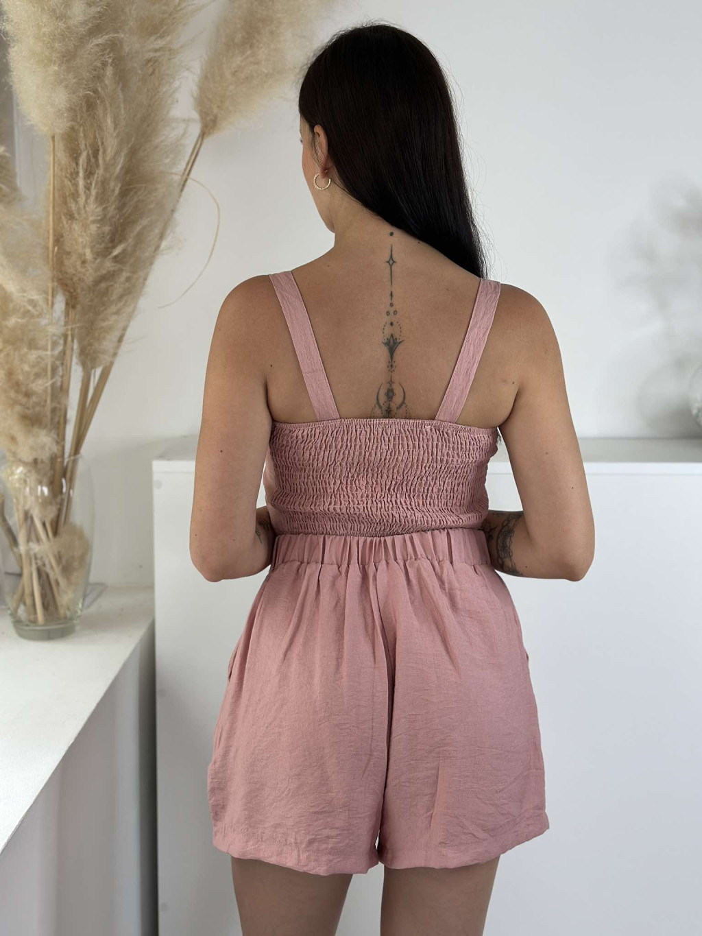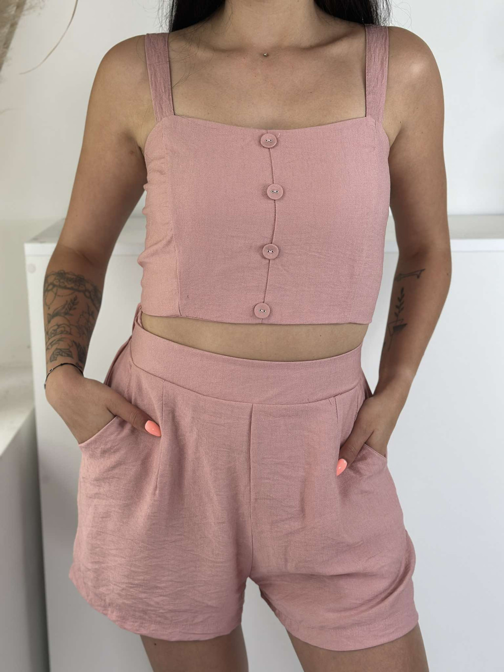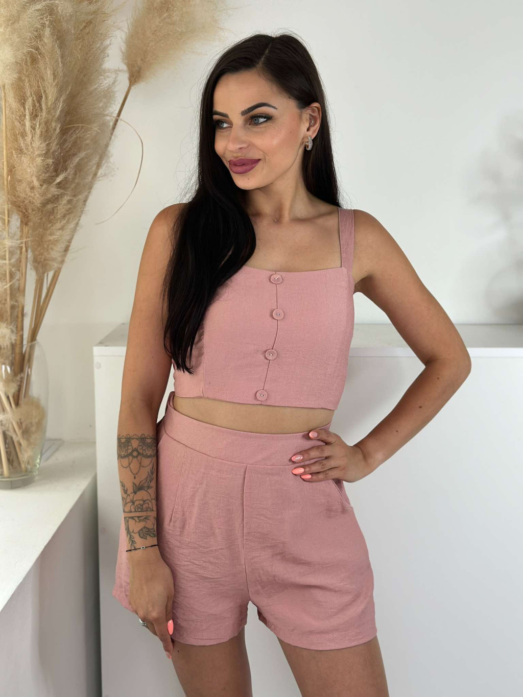 Lenvászon hatású, nem rugalmas anyagú szett. Rövid derekú, díszgombos, hátán gumírozott, magas, gumis derekú, zsebes rövidnadrággal. A Modell S/M méretet visel.