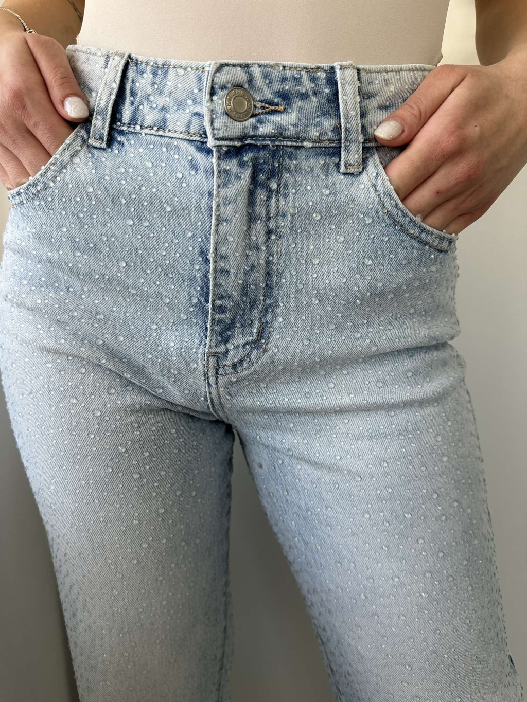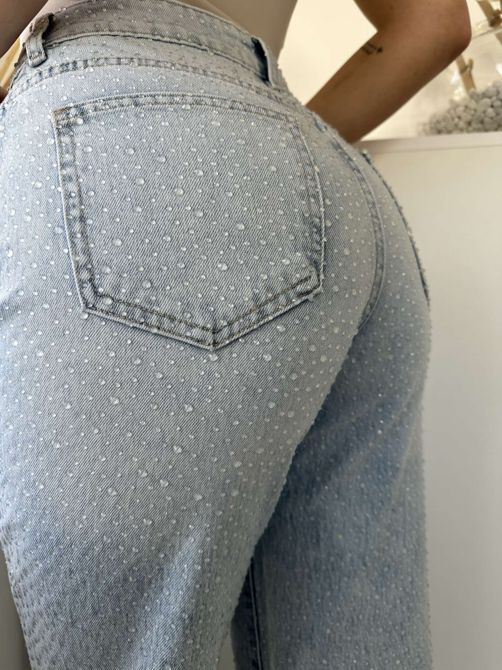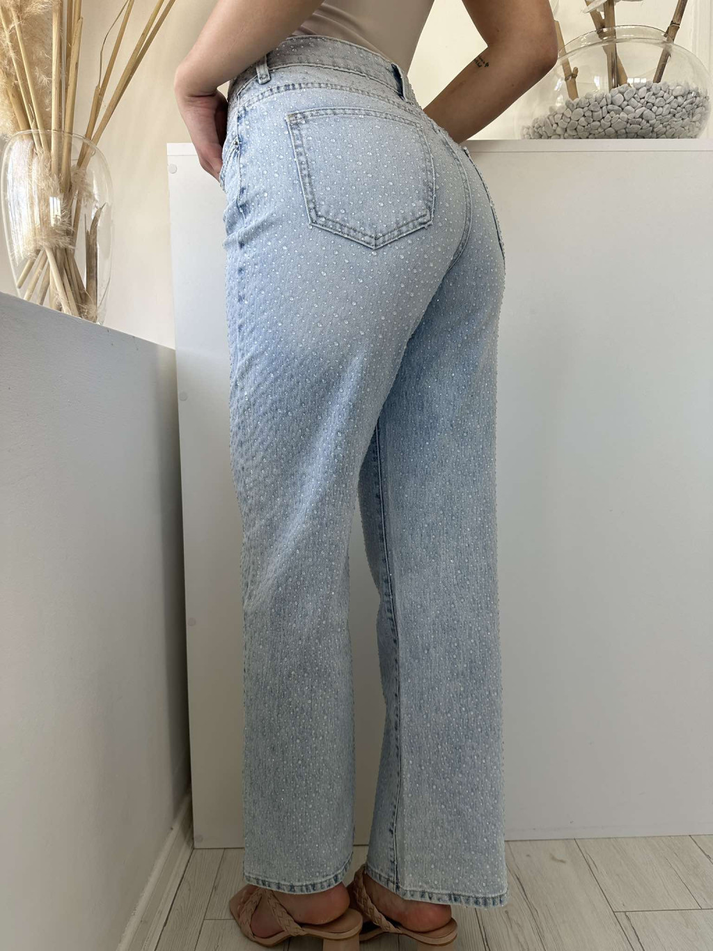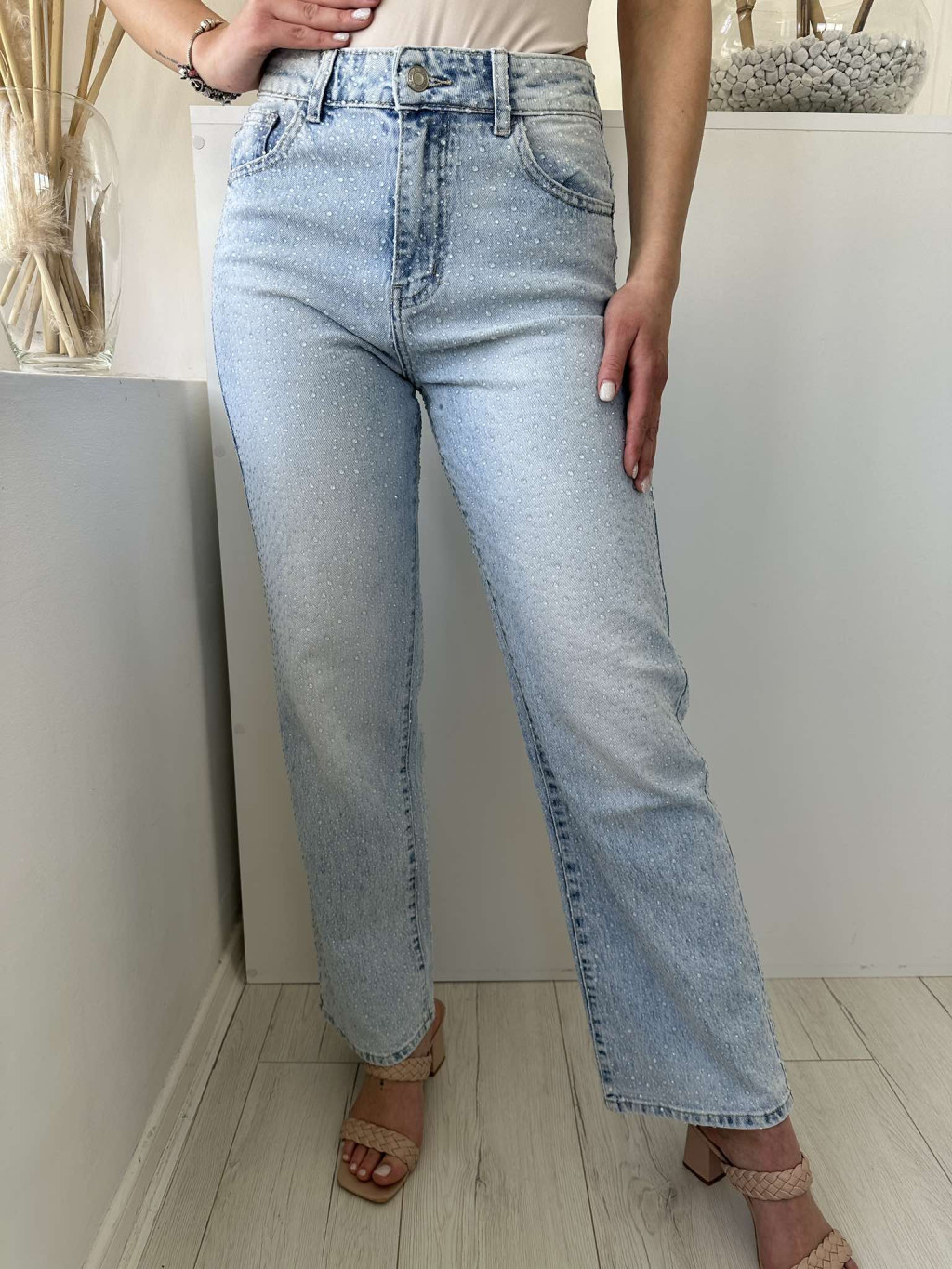 Magas derekú, kövekkel díszített, nem rugalmas anyagú, egyenes szárú, zsebes farmernadrág. A Modell S méretet visel. (XS-XL méretekben.)