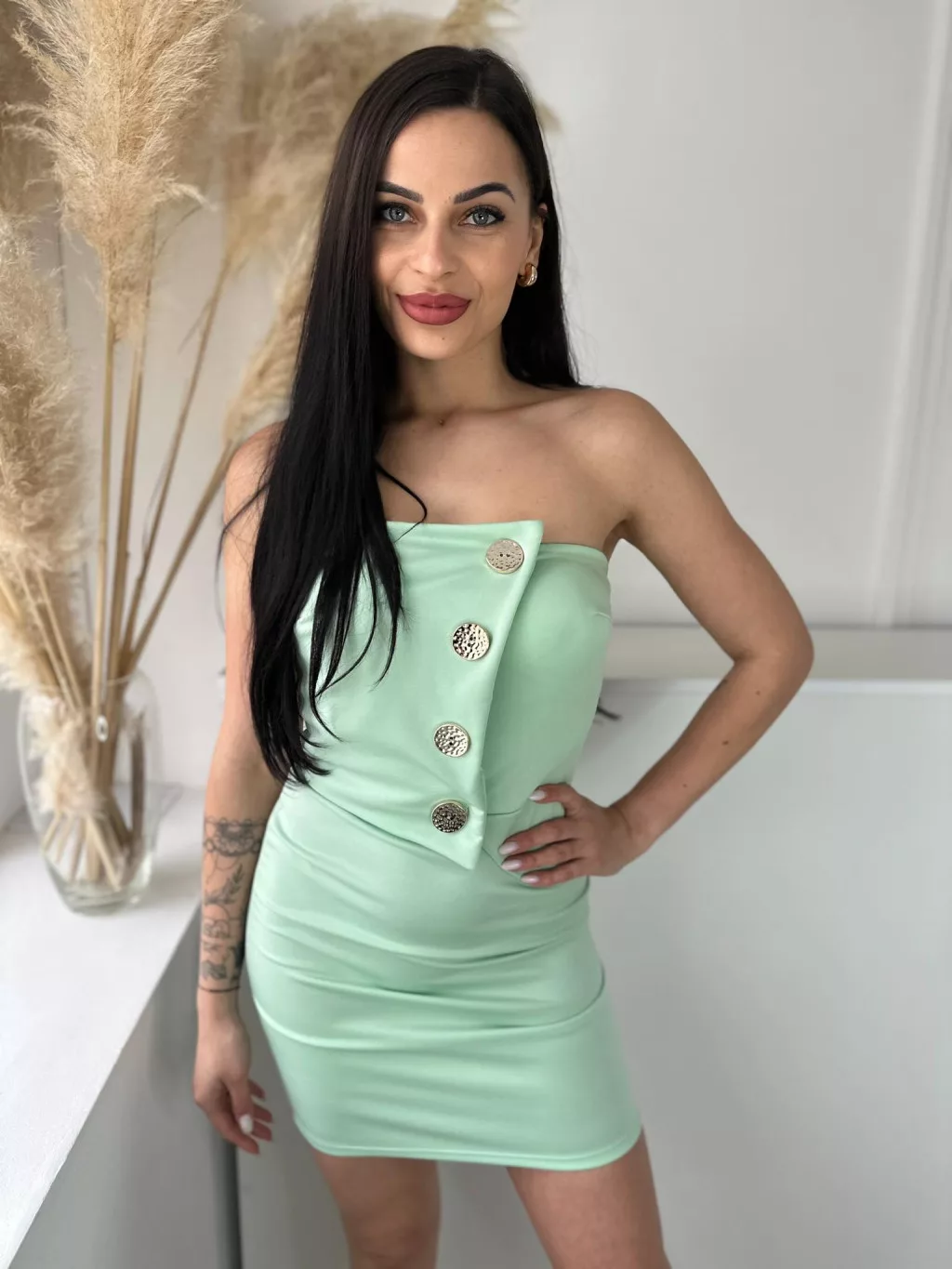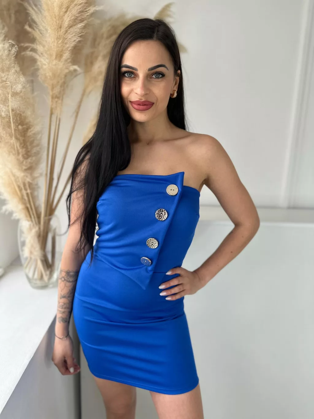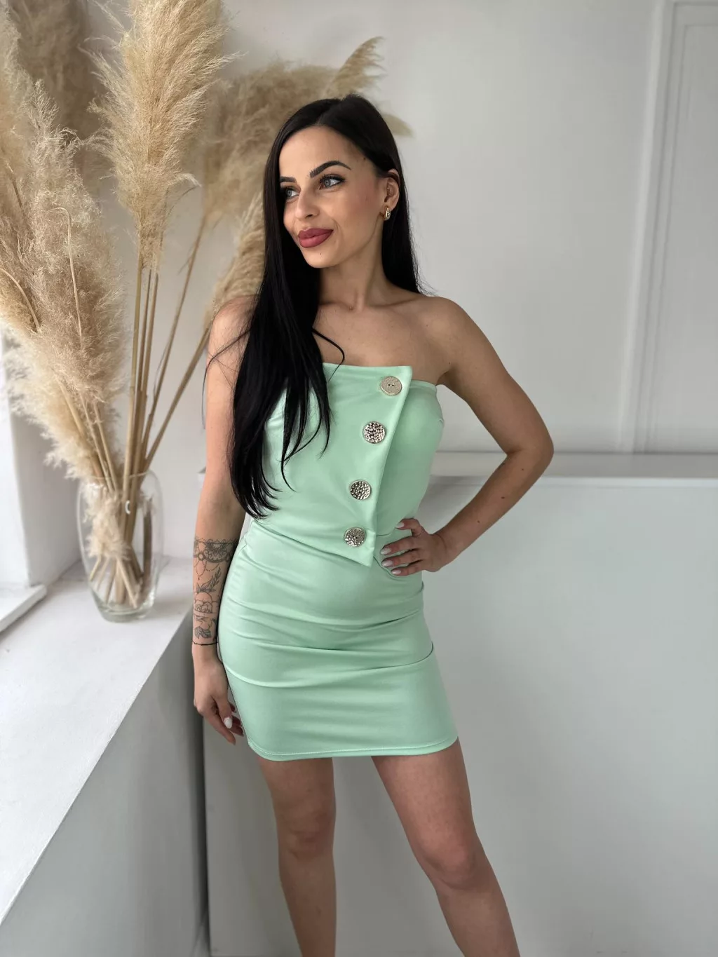 Rugalmas anyagú, szivacsbetétes, mellrésznél gumírozott, átlapolt, díszgombos, pánt nélküli ruha. (XS - M méretre ajánljuk)