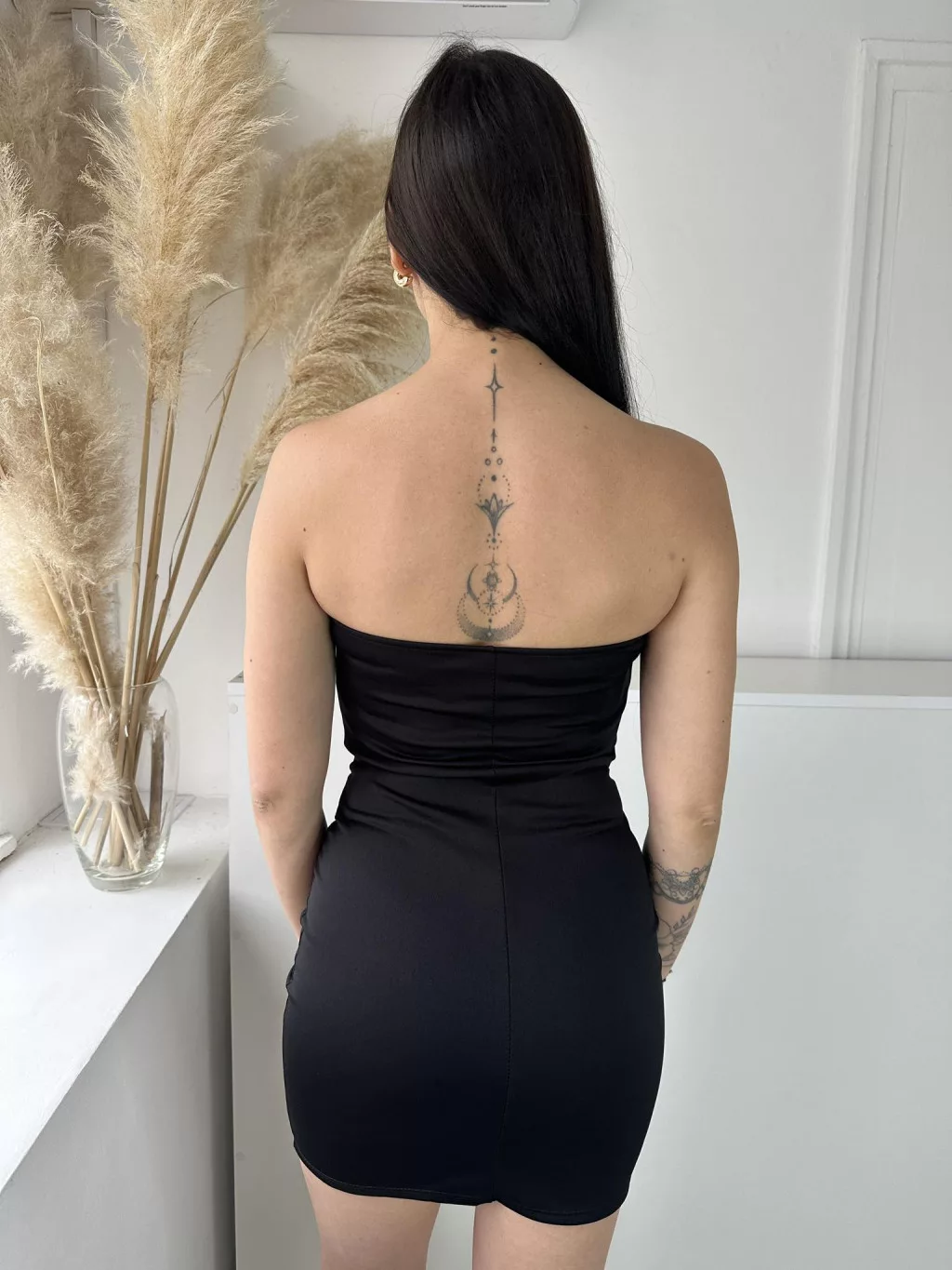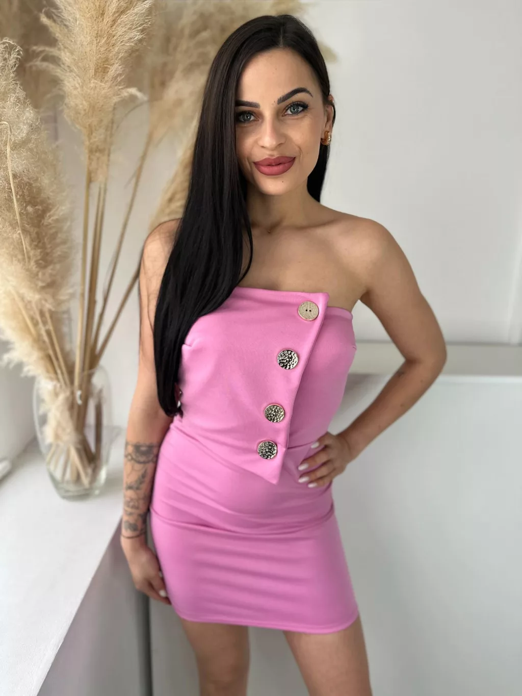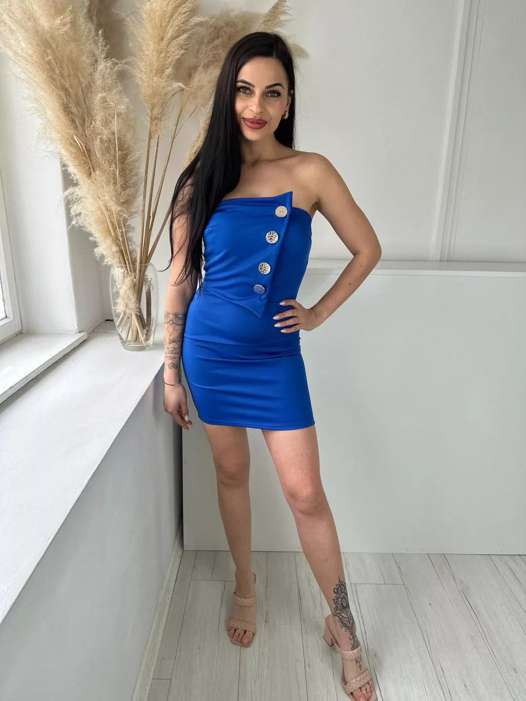 Rugalmas anyagú, szivacsbetétes, mellrésznél gumírozott, átlapolt, díszgombos, pánt nélküli ruha. (XS - M méretre ajánljuk)