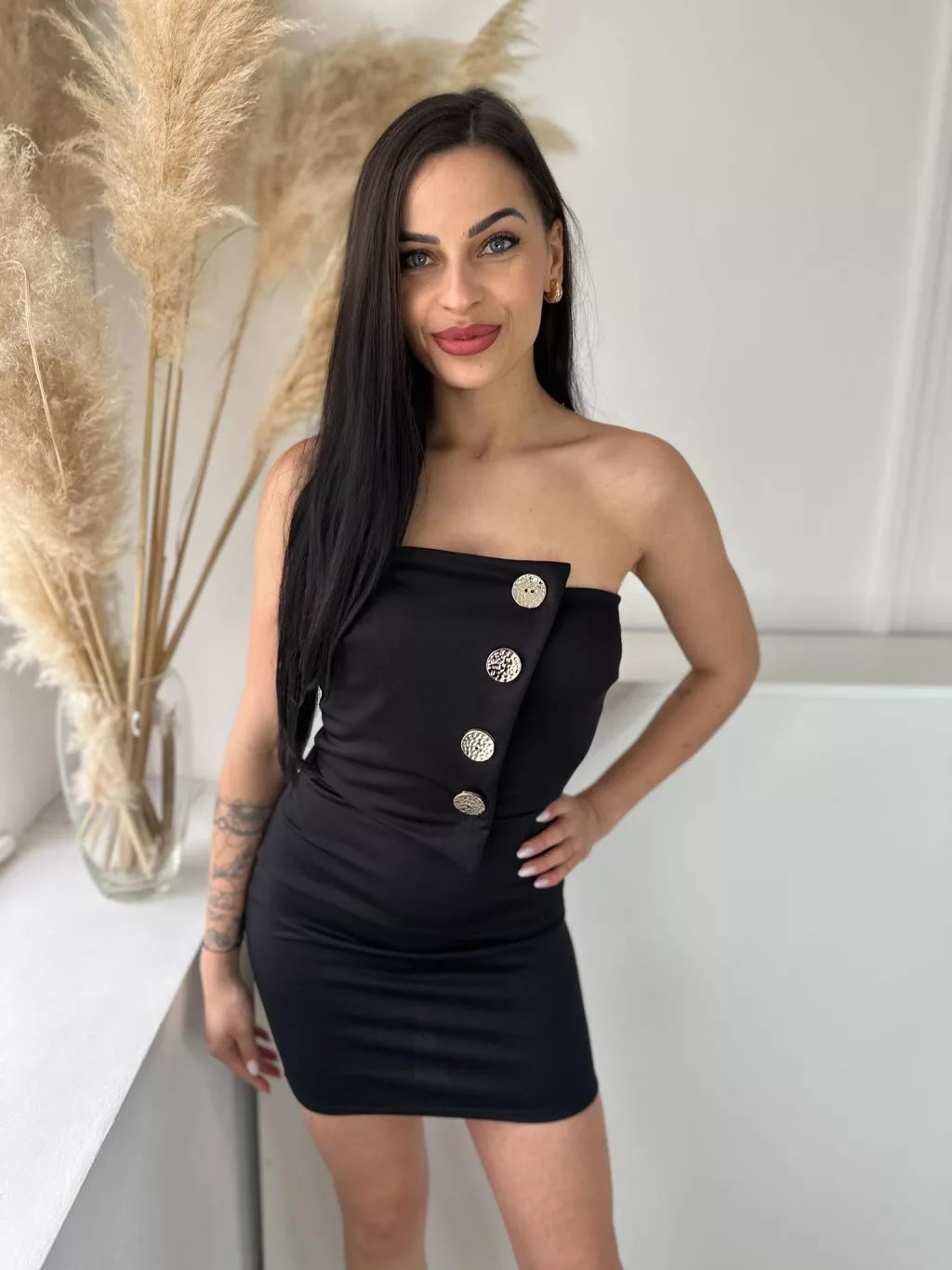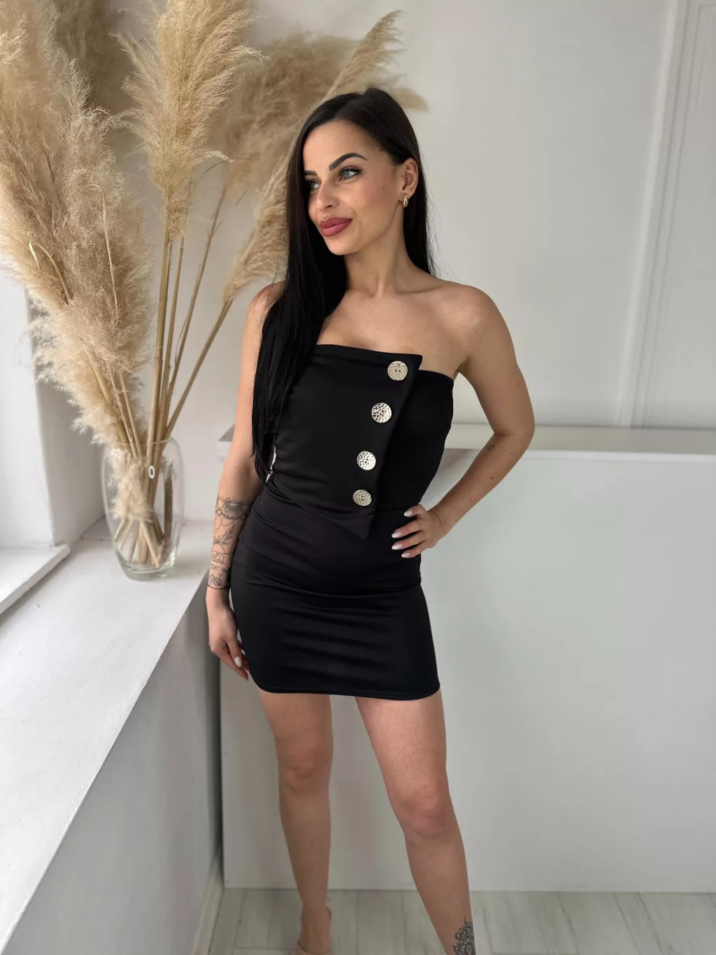 ÚJ Rugalmas anyagú, szivacsbetétes, mellrésznél gumírozott, átlapolt, díszgombos, pánt nélküli ruha. (XS - M méretre ajánljuk)