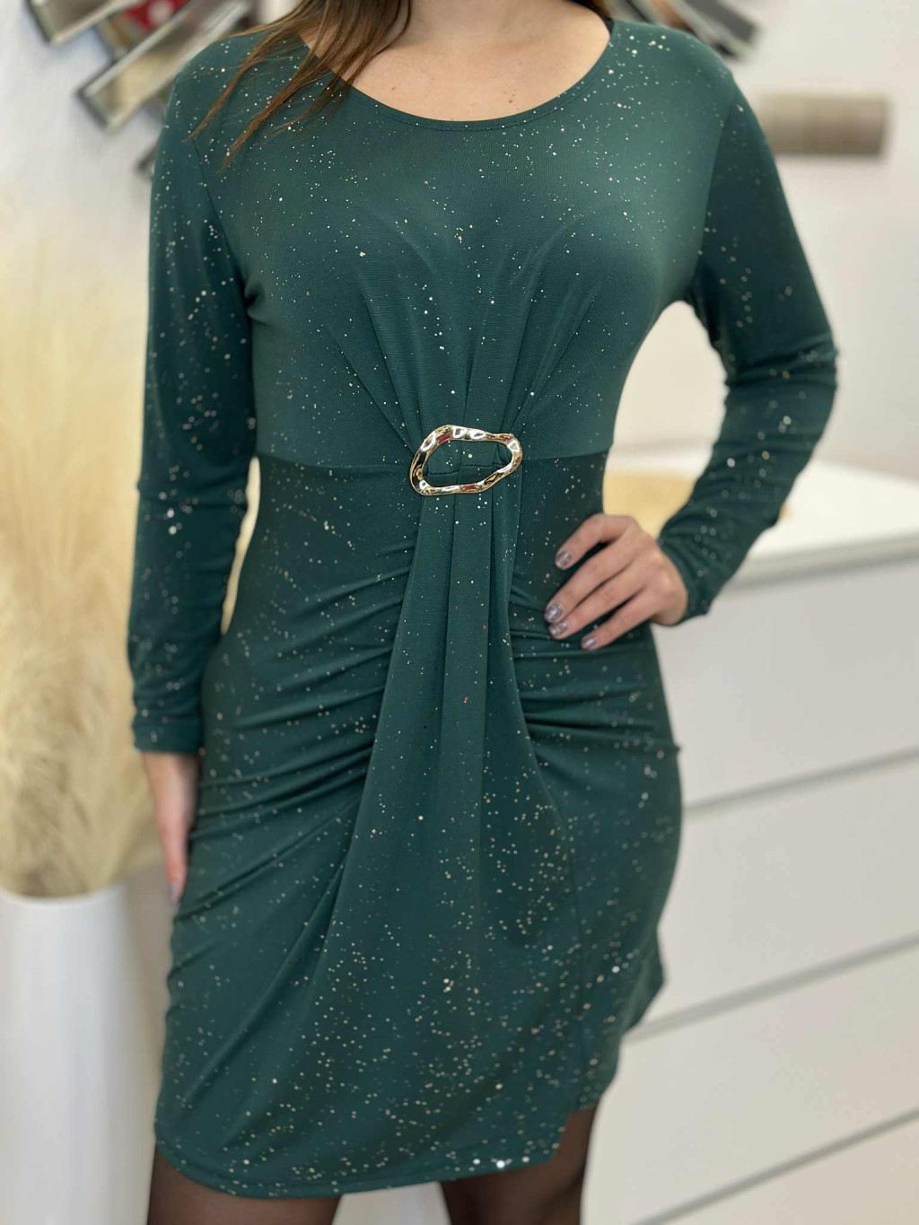 Elegáns, rugalmas anyagú, csillogós ruha . Testhezálló, elöl húzott, kereknyakú. (S-L méretre ajánljuk.)