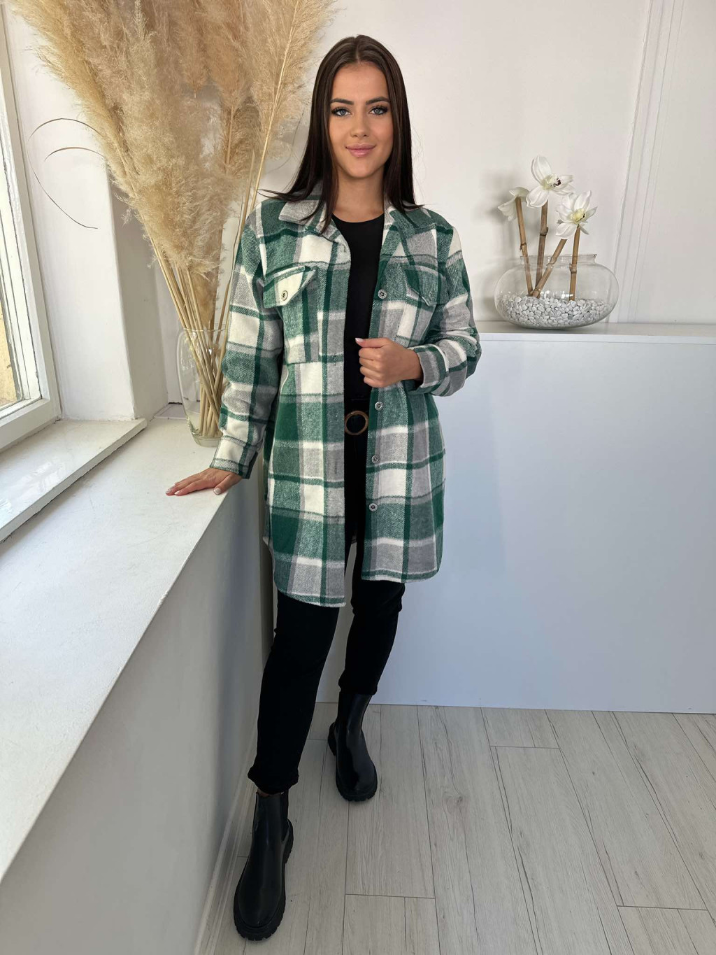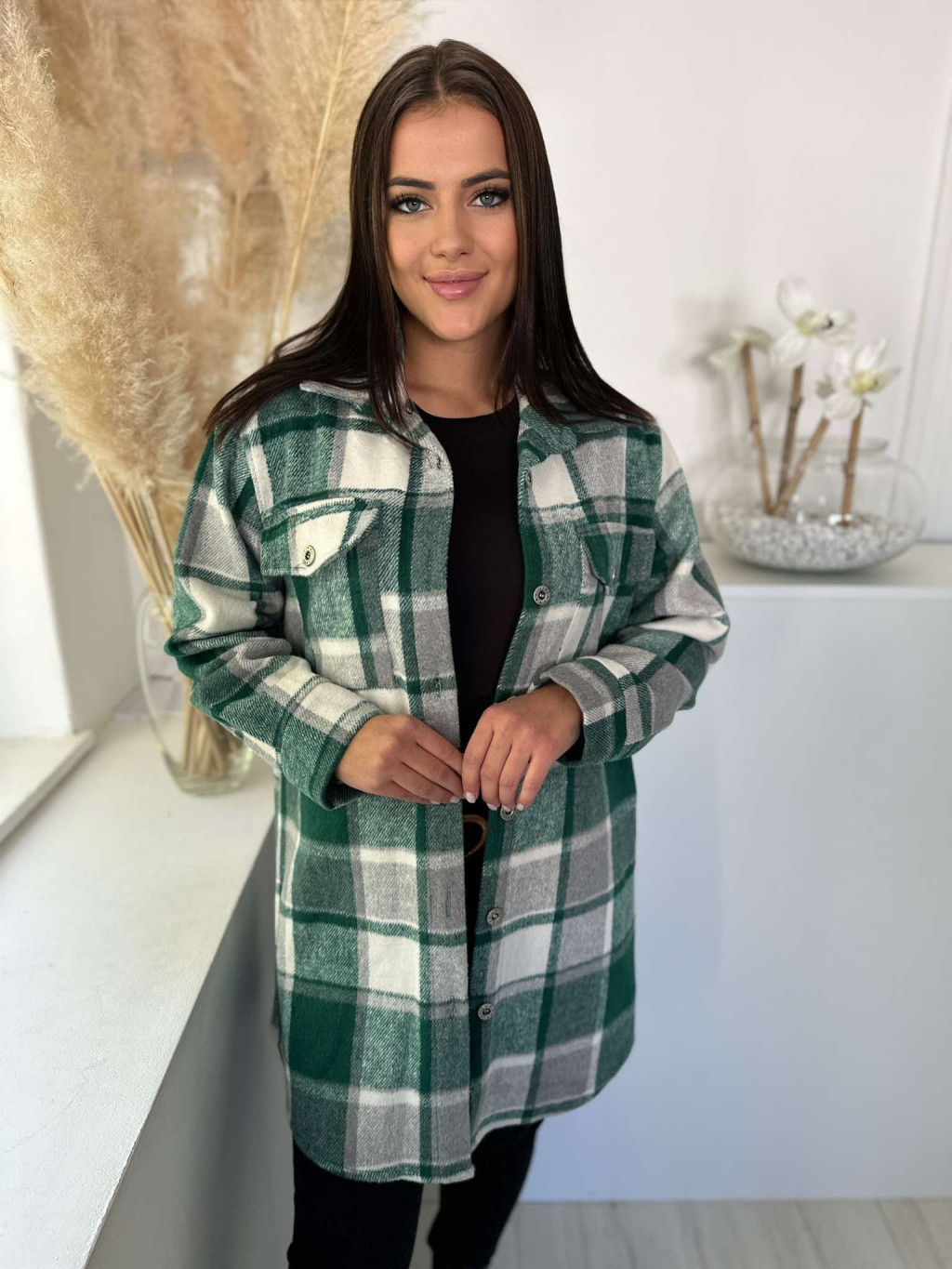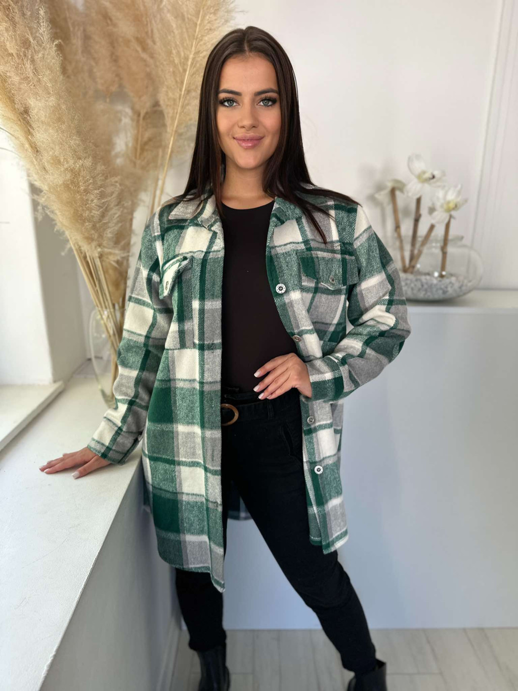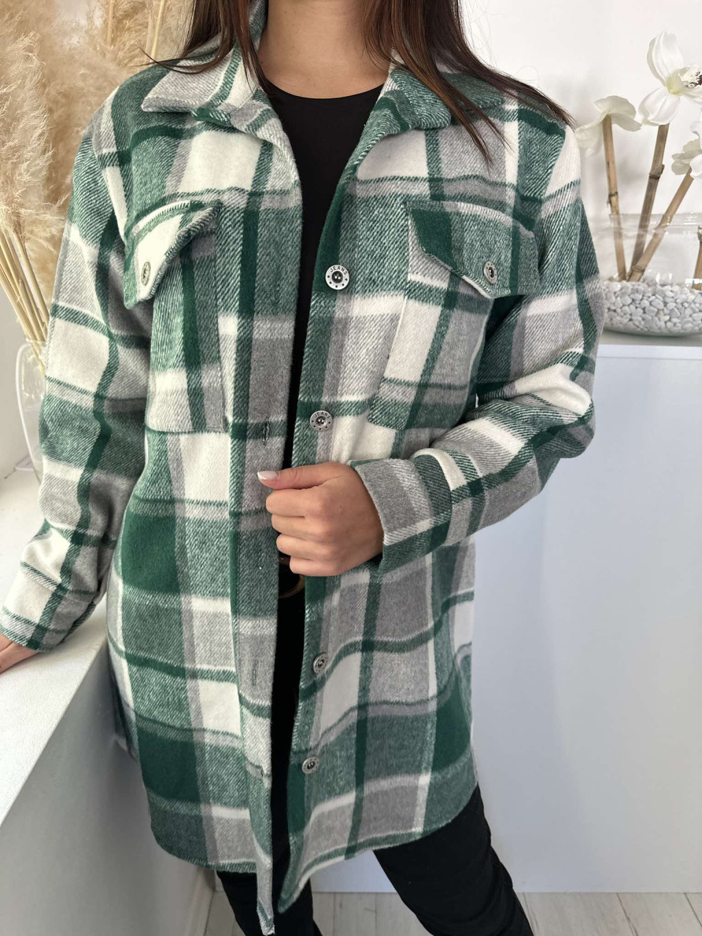 Oversize fazonú, béleletlen, nem rugalmas anyagú, gombos ingkabát. (S-L méretre ajánljuk.)