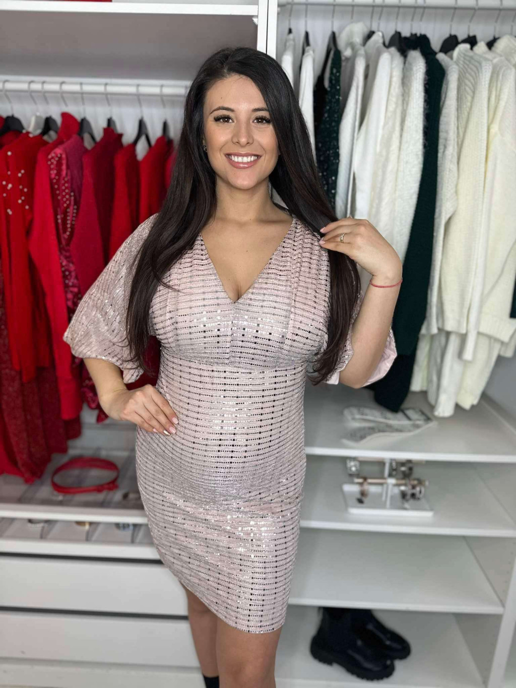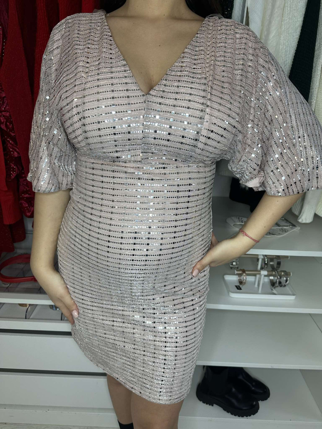 Csillogós, A vonalú, V kivágású, hátán cipzáras, nem rugalmas, alkalmi ruha. A Modell 36-os méretet visel.