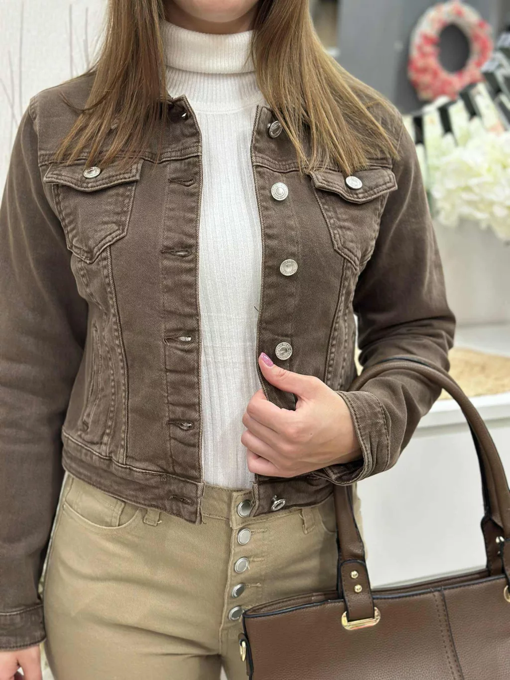 Csinos, gombos, zsebes, nem rugalmas anyagú farmerdzseki. A Modell S méretet visel. (S-XXL méretekben.)