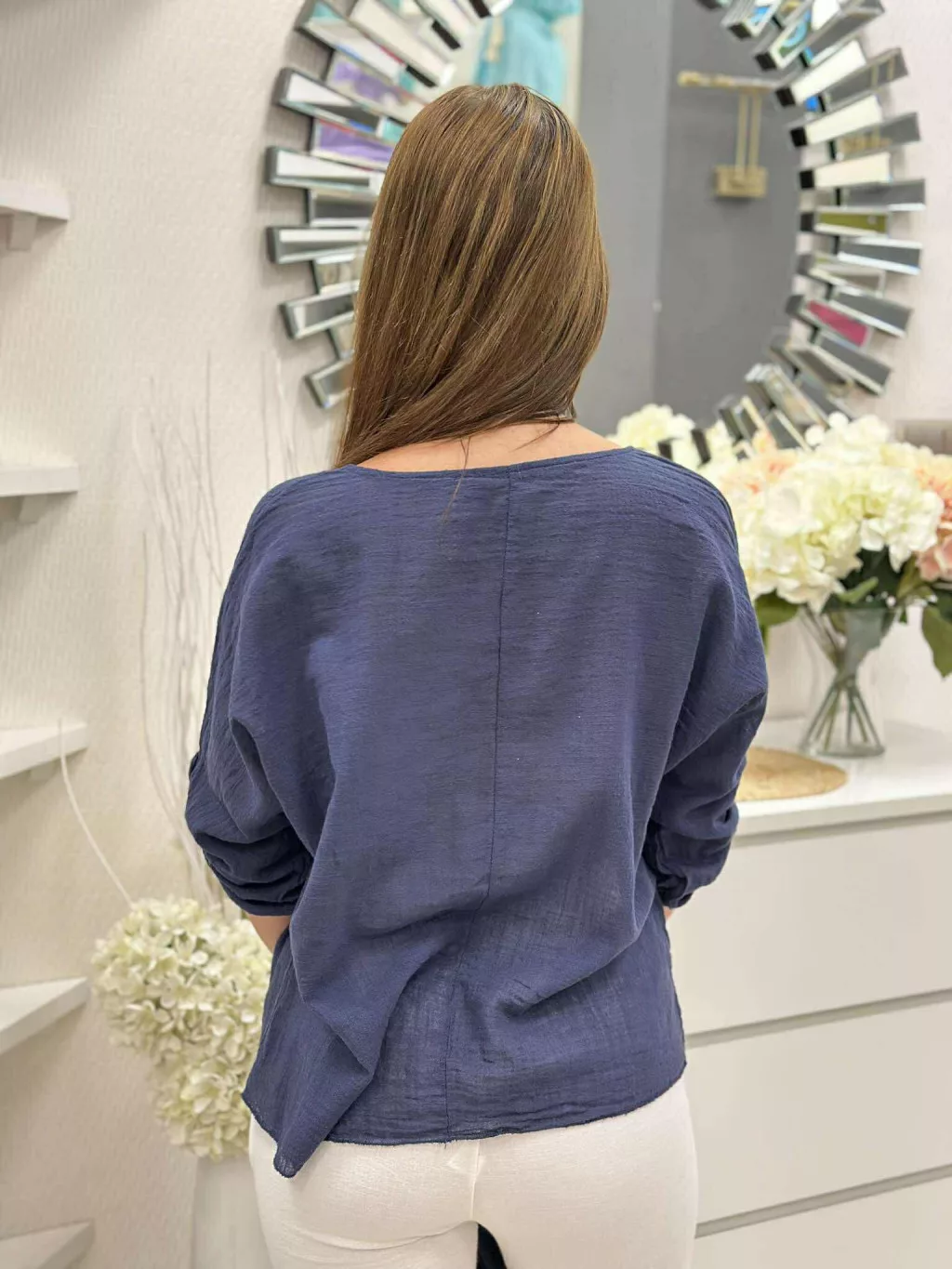 Lenge fazonú, lenvászon hatású, nem rugalmas anyagú, ujján felgombolható, megkötős felső. (S-XL méretre ajánljuk.)