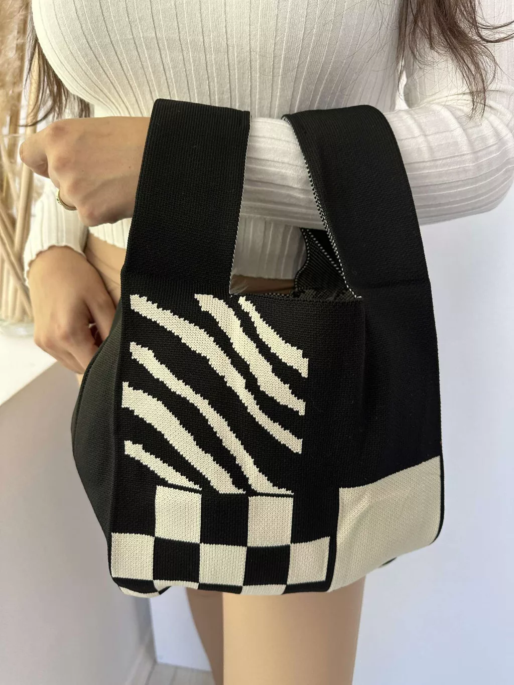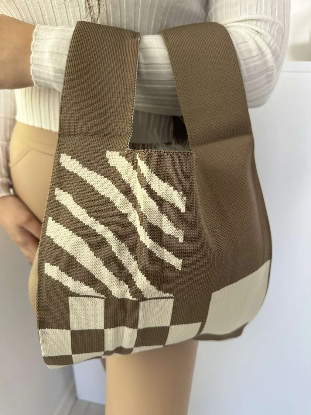 Rugalmas, kötött anyagú ksitáska. Szélesség: 24,5 cm, Magasság: 46,5 cm.