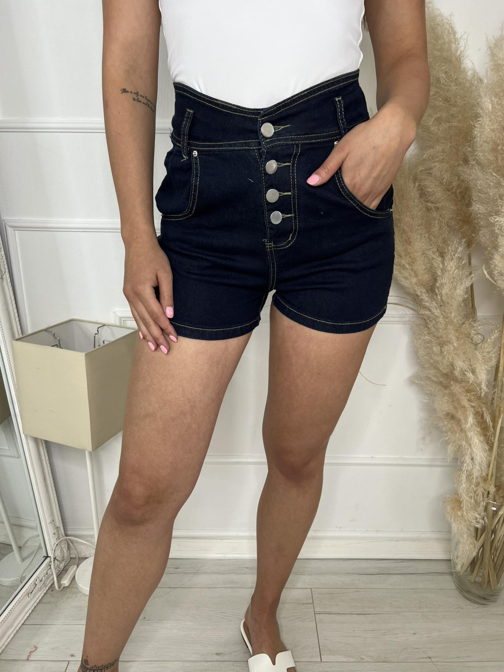 Rugalmas anyagú, magas derekú, zsebes, gombos rövidnadrág. M-es méretben.