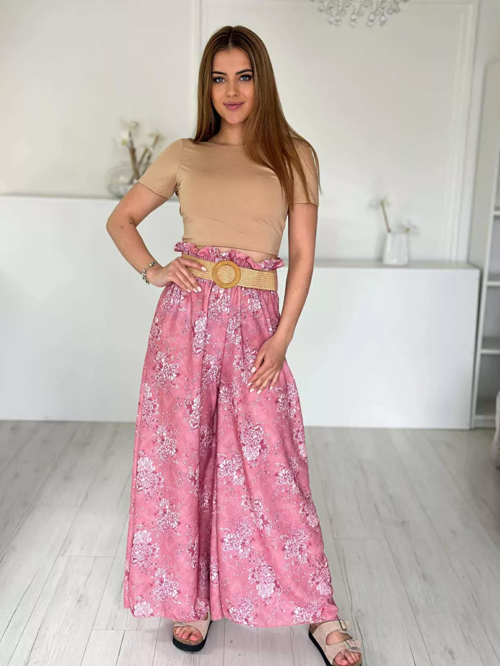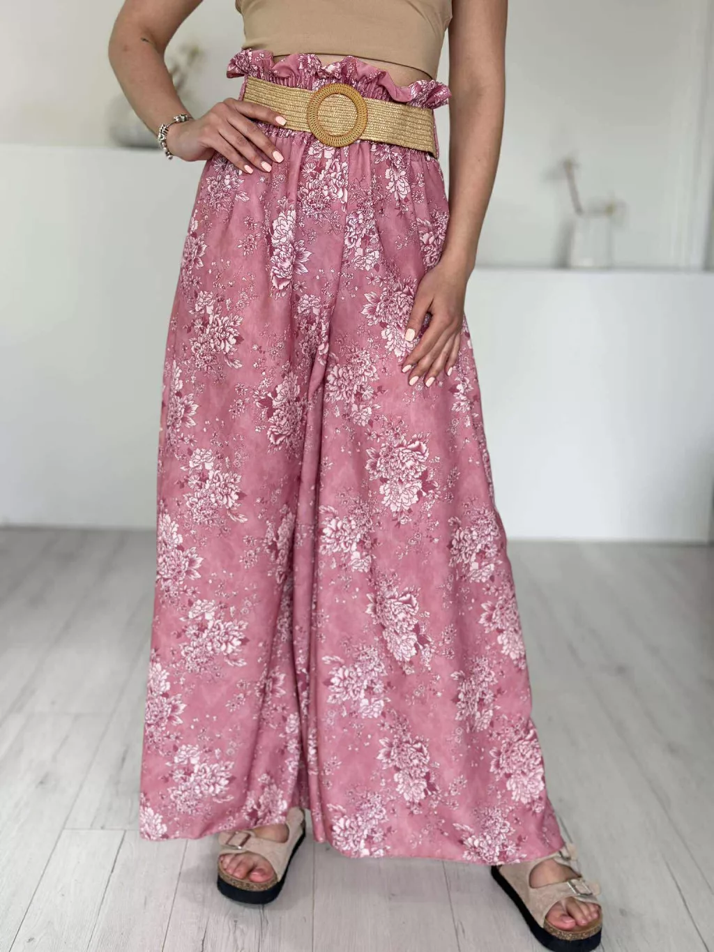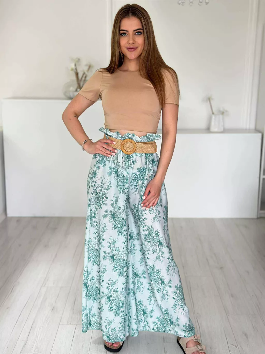 Lenge fazonú, lenvászon hatású, magas, gumis derekú, nem rugalmas anyagú, mintás nadrág övvel. (S-L méretre ajánljuk.)