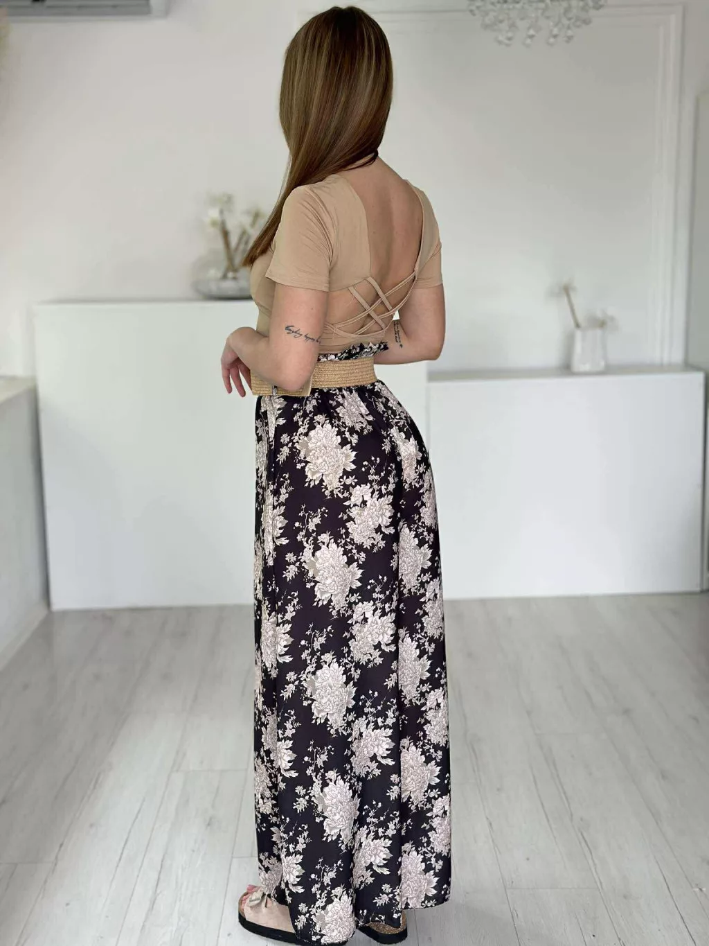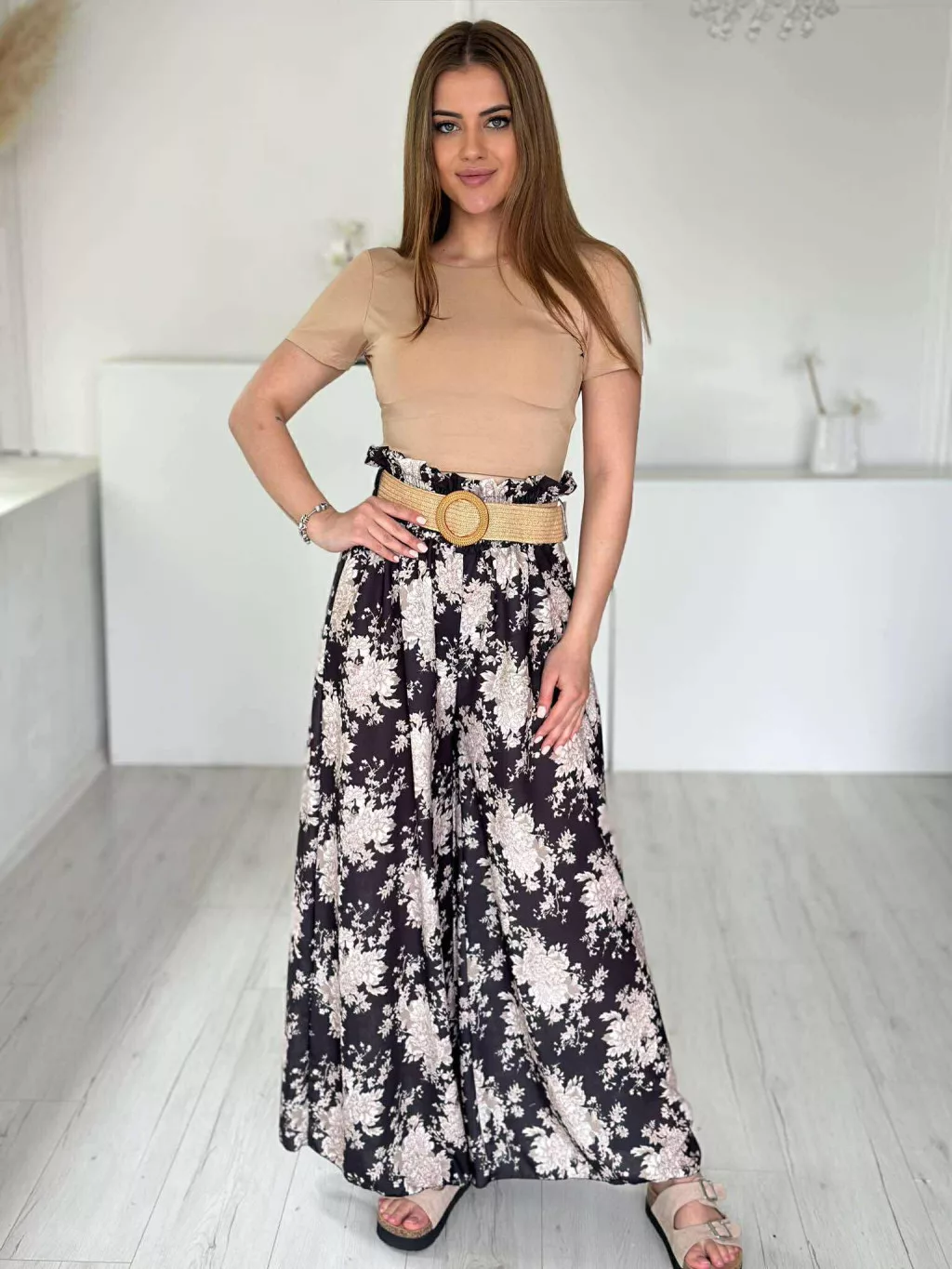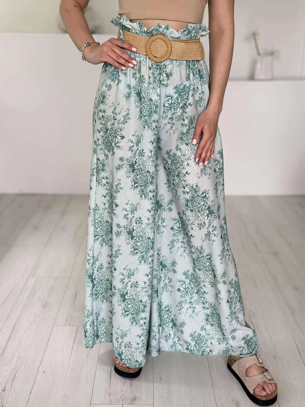 Lenge fazonú, lenvászon hatású, magas, gumis derekú, nem rugalmas anyagú, mintás nadrág övvel. (S-L méretre ajánljuk.)