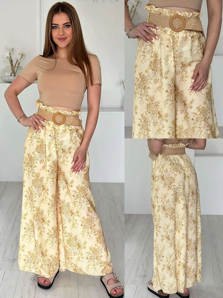 ÚJ Lenge fazonú, lenvászon hatású, magas, gumis derekú, nem rugalmas anyagú, mintás nadrág övvel. (S-L méretre ajánljuk.)
