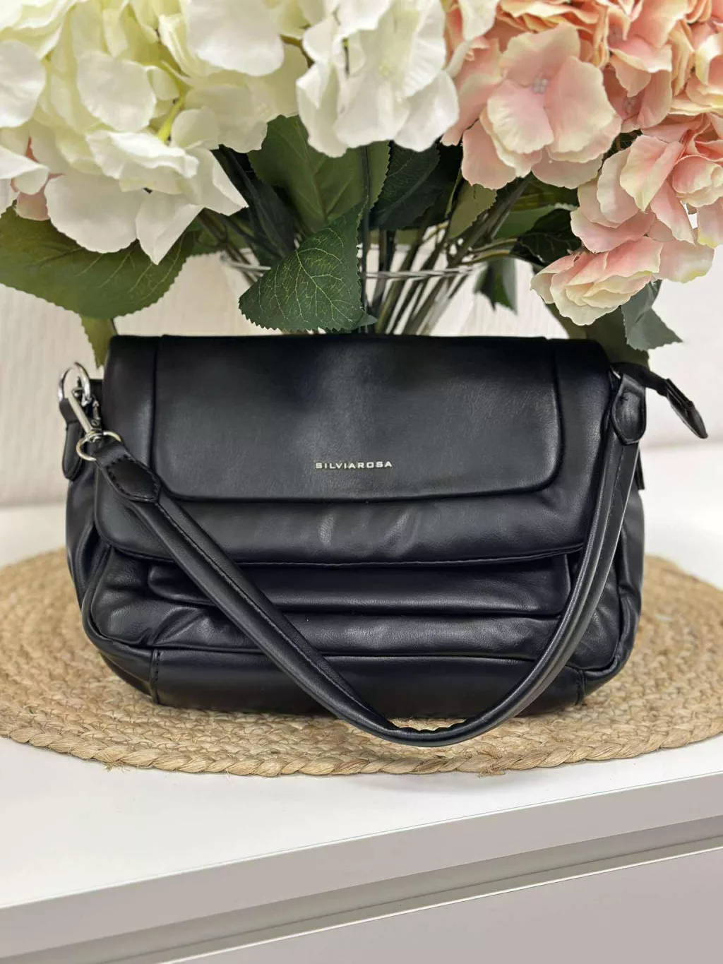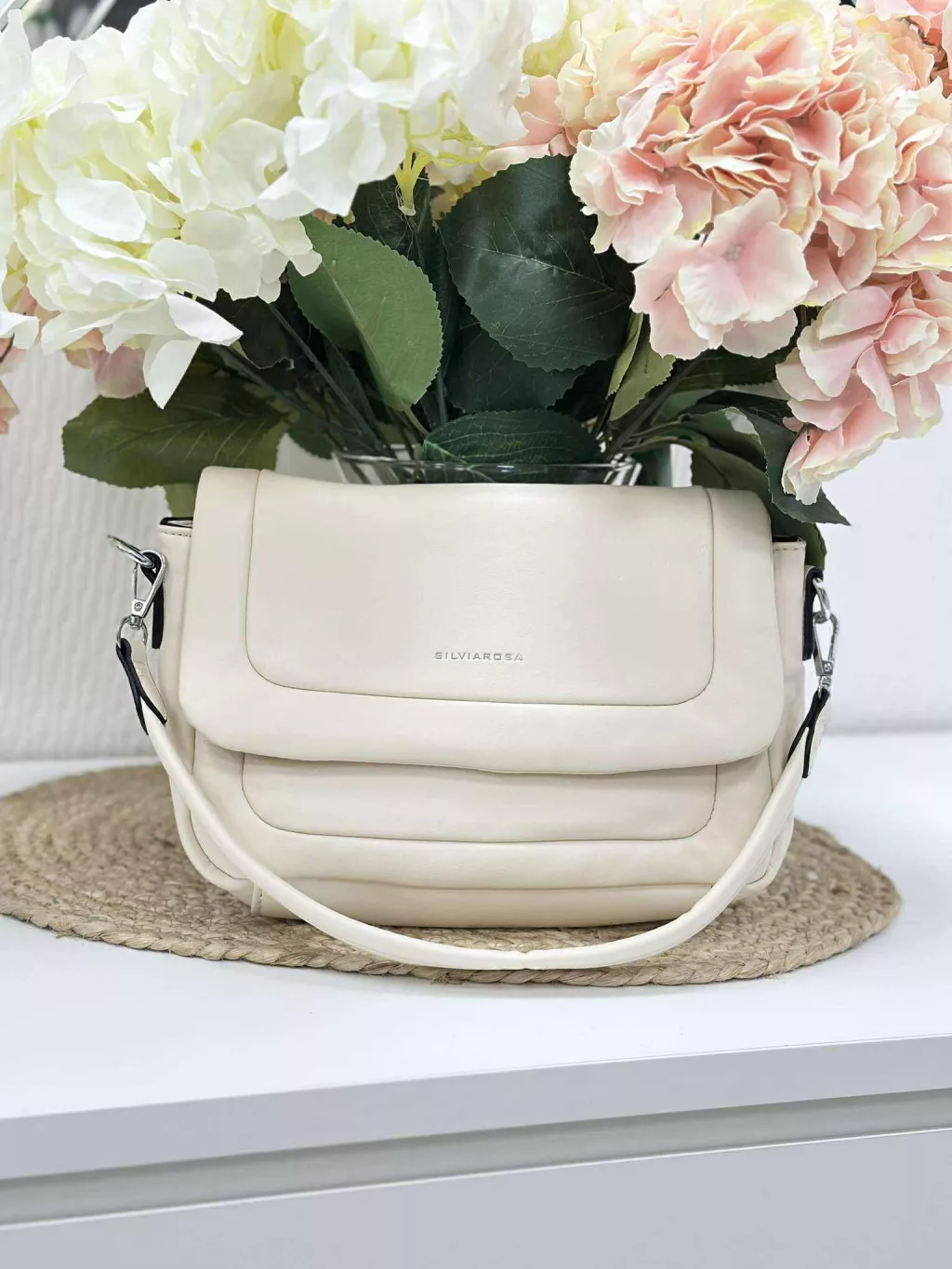 Puha, műbőr táska, levehető hosszú és rövid pánttal. Szélesség: 28cm Magasság: 18 cm.