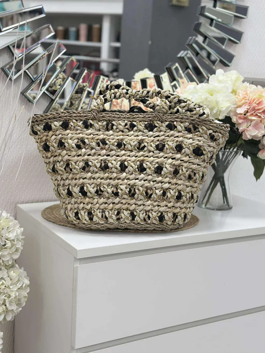 Nagyméretű, merev fazonú, cipzáras, nyári, fonott, rattan táska. 51 x 30 x 17 cm.