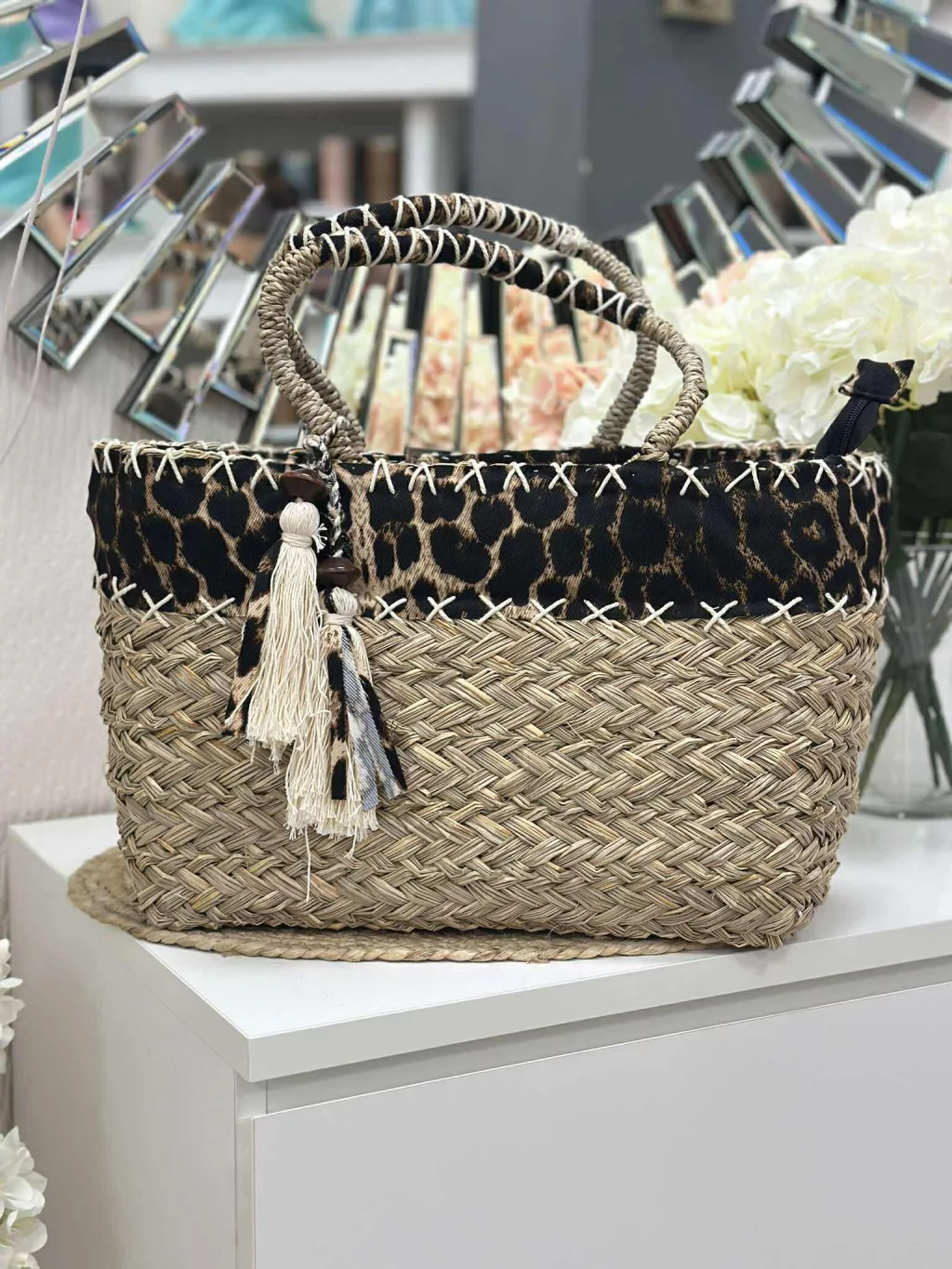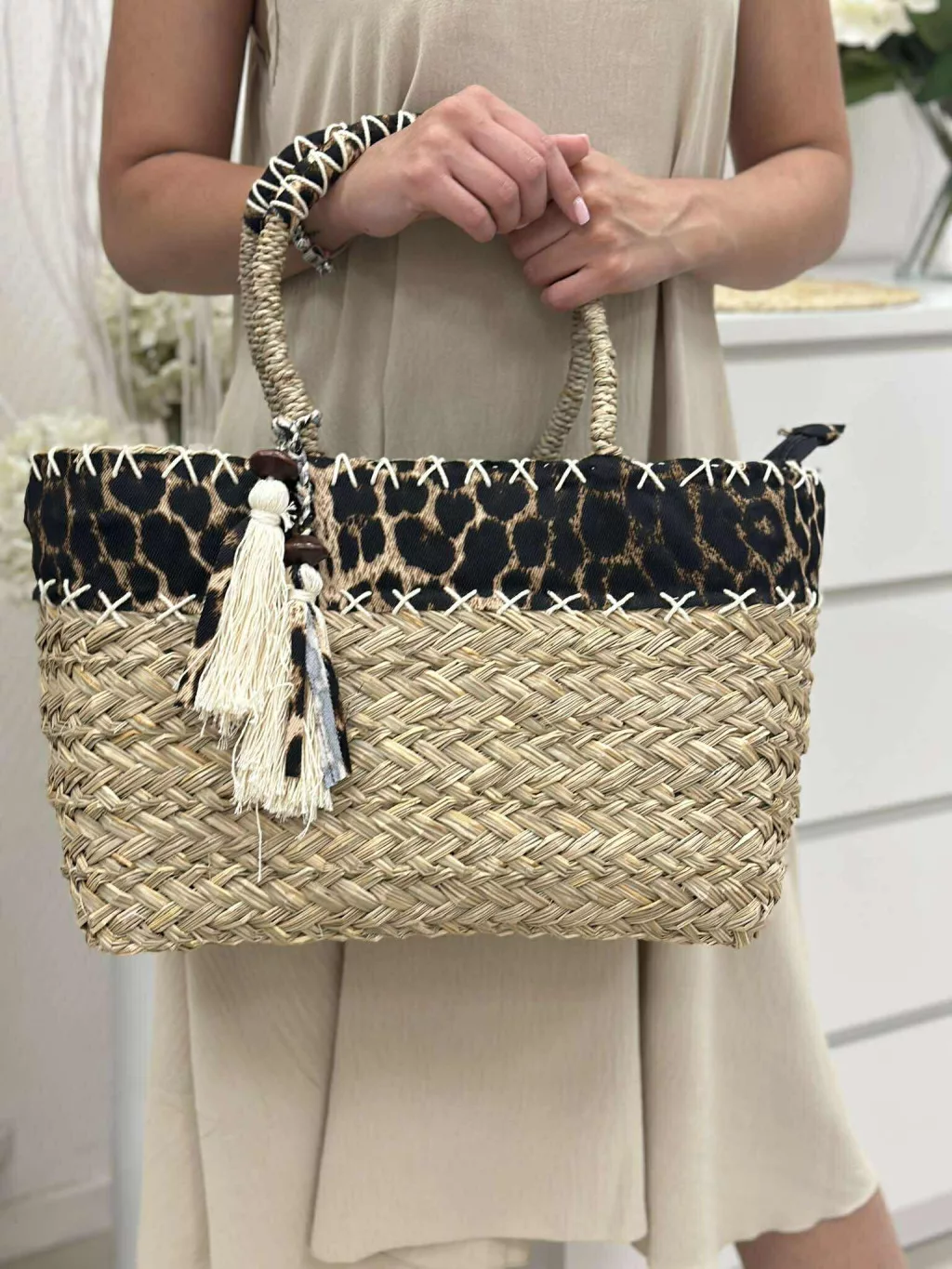 Nagyméretű, merev fazonú, cipzáras, nyári, fonott, rattan táska. 45 x 25 x 18 cm.