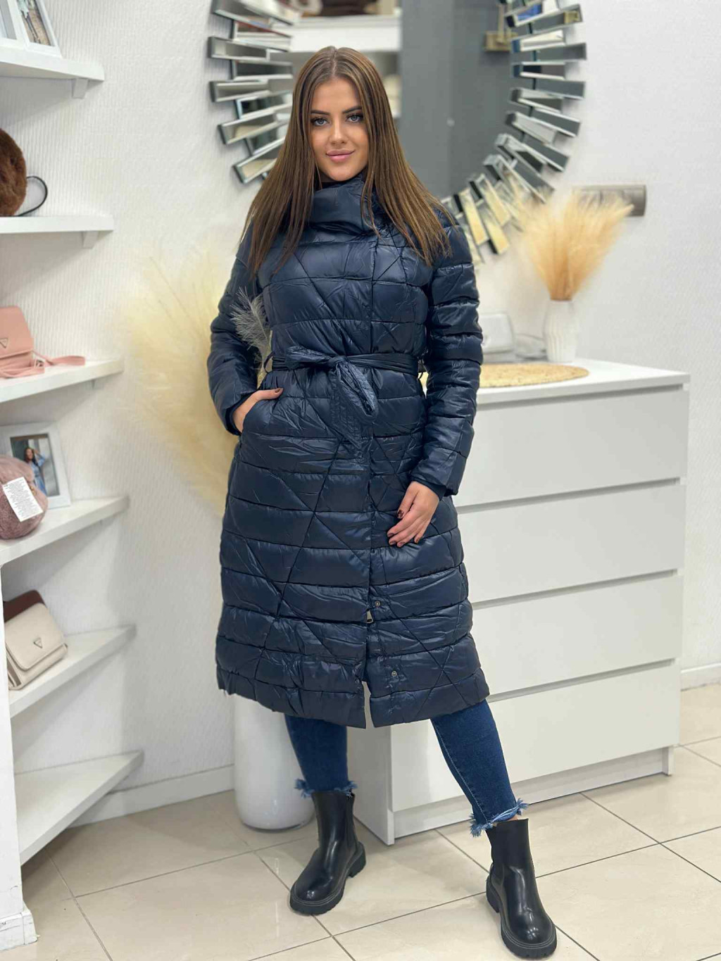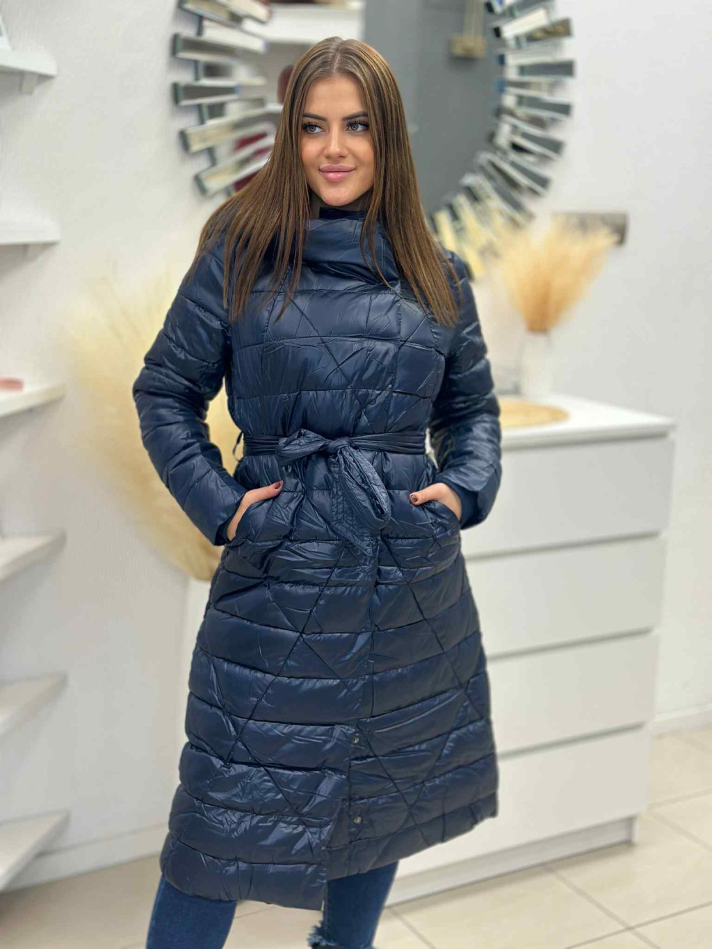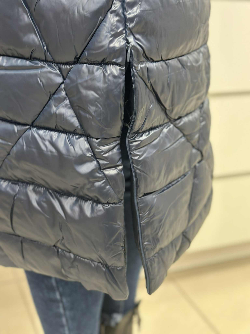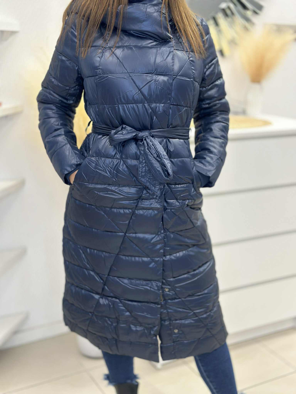 Steppelt, fényes anyagú, vastag télikabát . Vatelinnel bélelt, csinos, megkötős, kapucnis. A Modell S méretet visel.